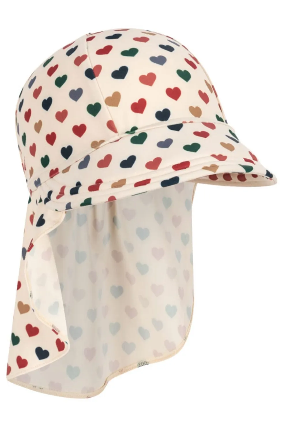 Solhat fra Konges Sløjd med brede skygger og nakkestykke med flæsekant. Hatten har et mønster med små hjerter i forskellige farver på lys bund.