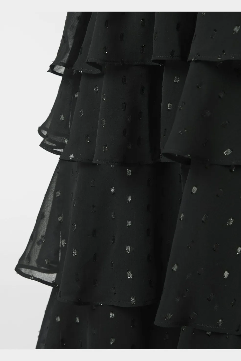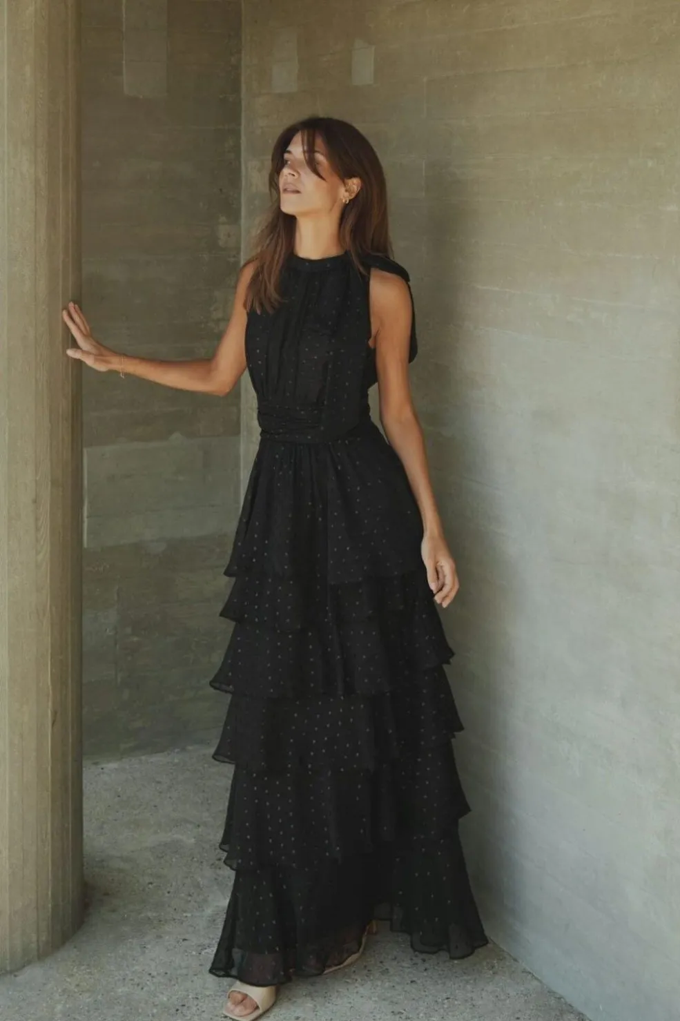 Sort lang kjole fra Neo Noir i chiffon-kvalitet med prikket mønster. Kjolen har høj hals med sløjfe og er bygget op i flere lag stof med flæser.