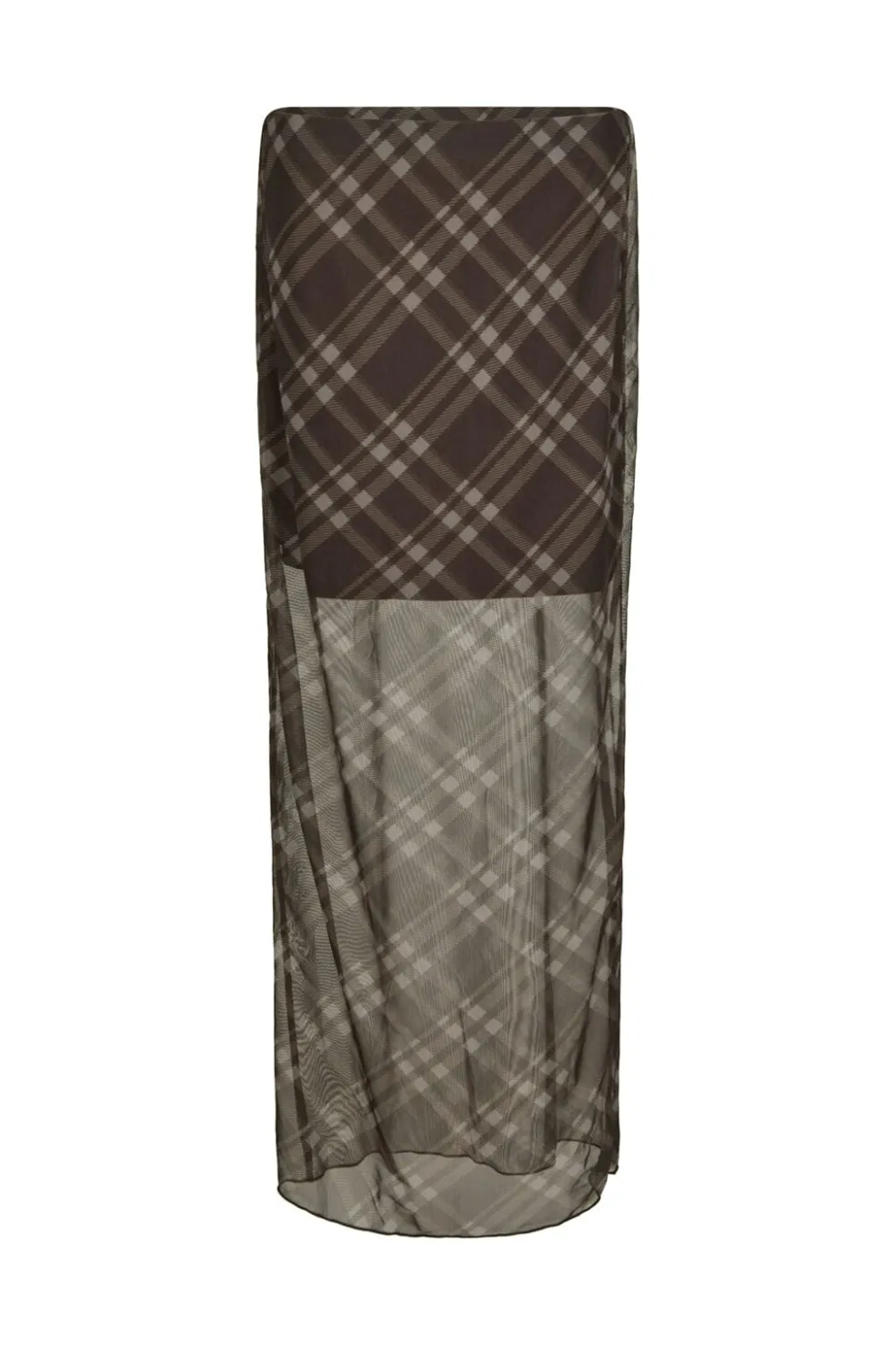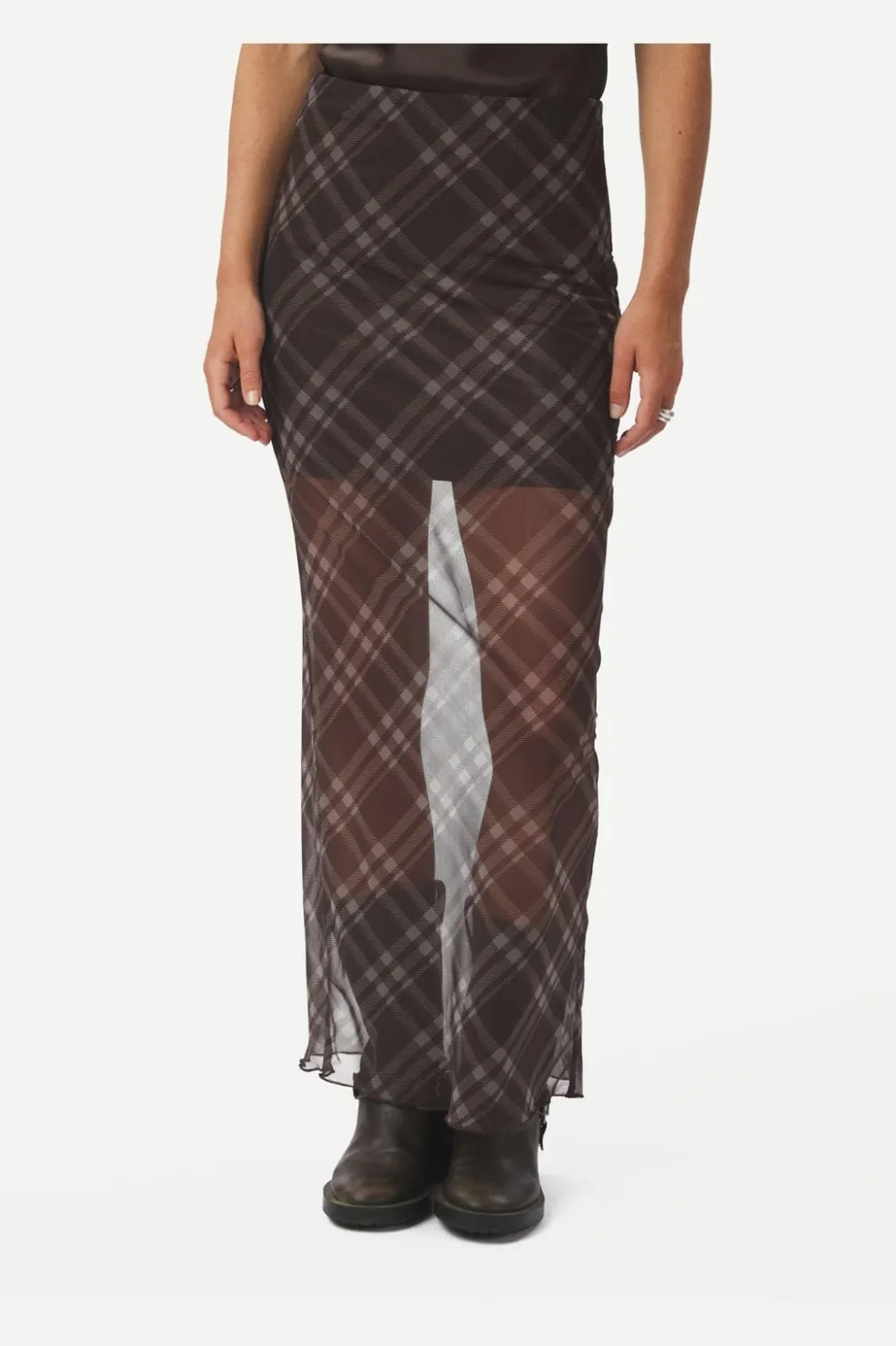 Ternet nederdel fra Neo Noir i mørkebrun med mesh-lag. Nederdelen har et delvist gennemsigtigt udseende i toppen og et kortere foer indeni.