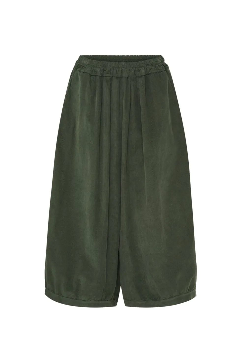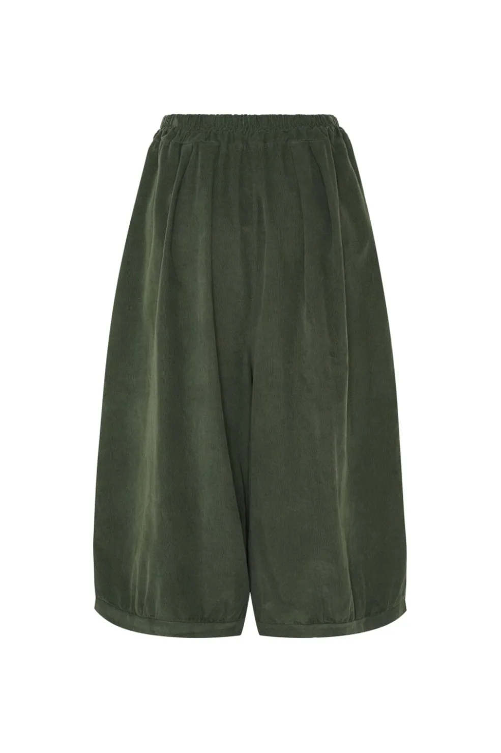 Bukser fra Marta Du Chateau i militærgrøn babyfløjl. Bukserne har en løs pasform med brede ben og en elastisk talje, der giver god bevægelighed.