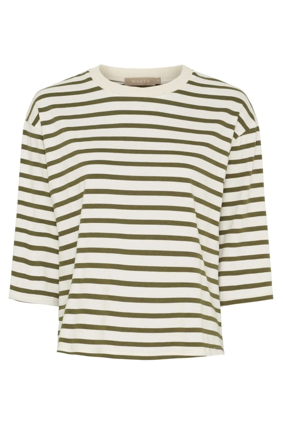 Stribet t-shirt fra Marta Du Chateau med beige og militærgrønne striber. T-shirten har en løs pasform med 3/4-ærmer og rund hals.