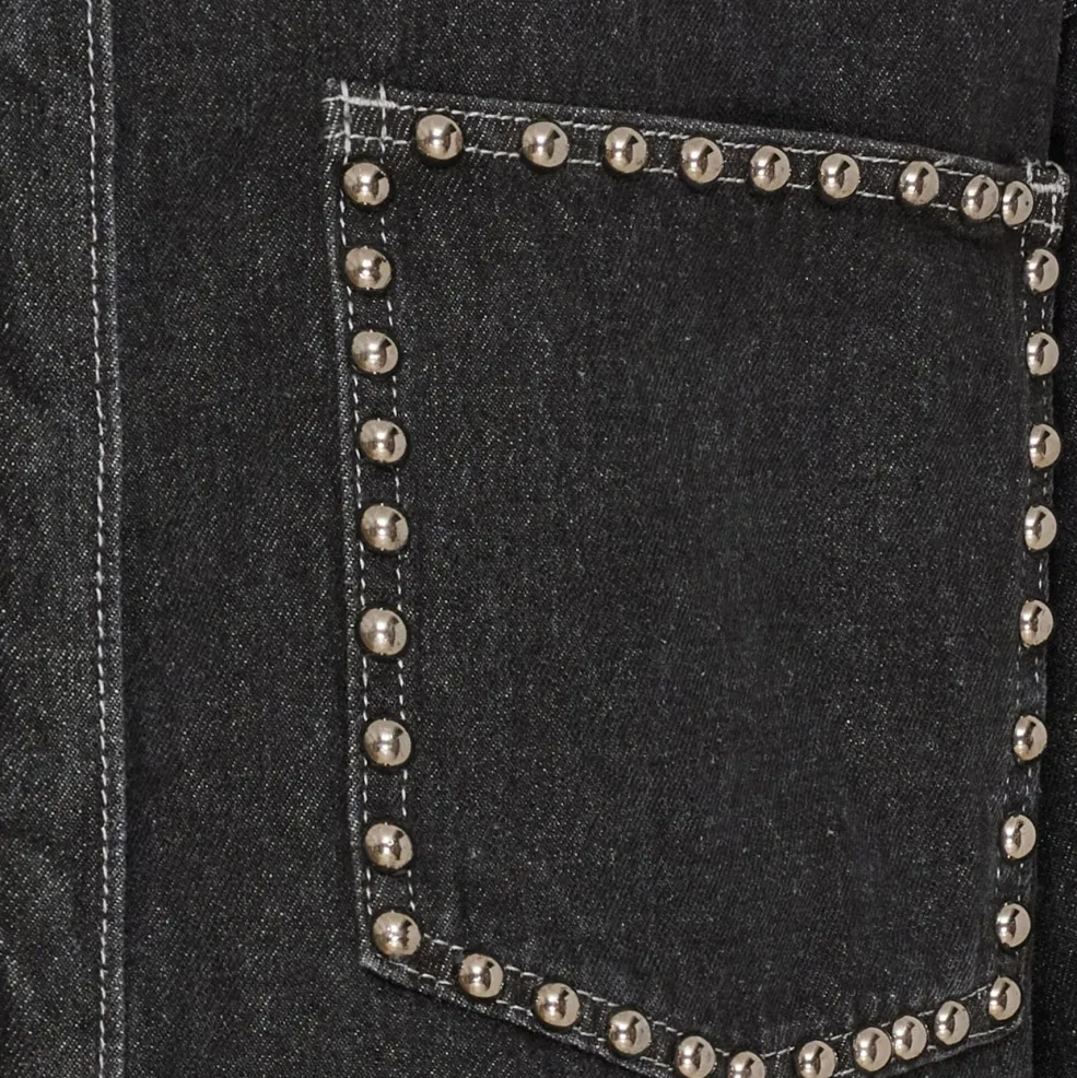 Grå skjorte fra Marta Du Chateau med perledetaljer langs kraven, lommerne og ærmerne. Skjorten har en oversized pasform og 3/4-ærmer.