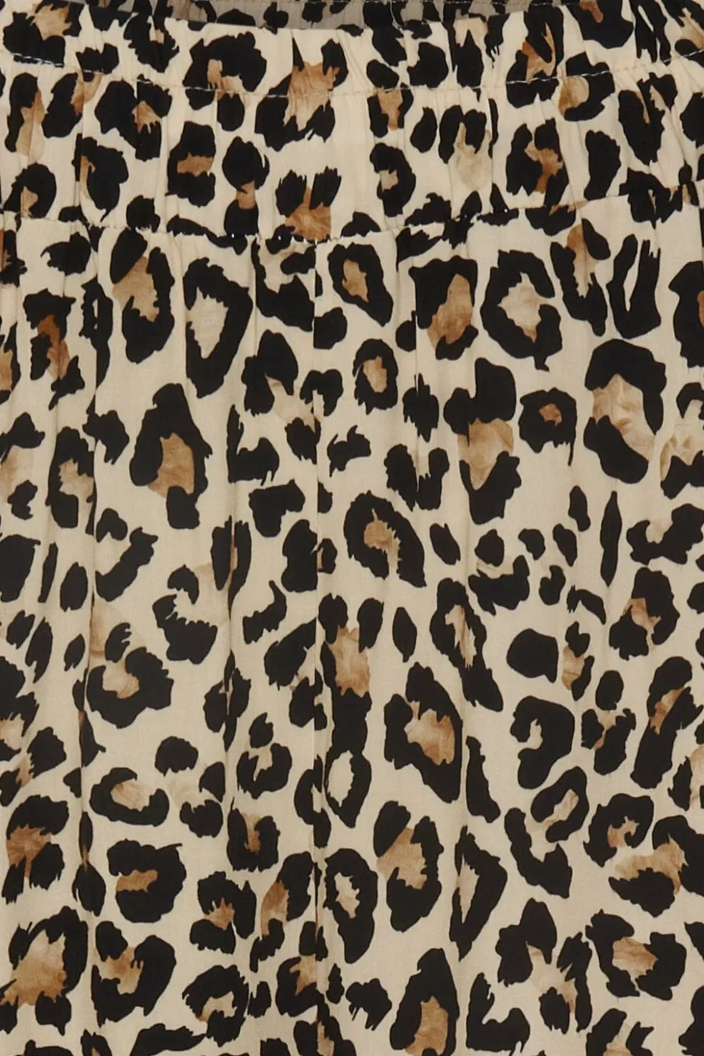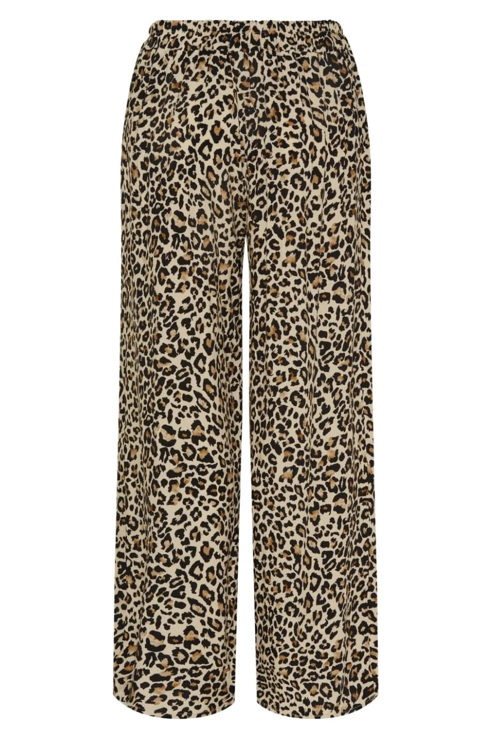 Bukser fra Marta Du Chateau i beige leopardmønster. Bukserne har en bred benstil med flæsedetaljer og en praktisk elastisk talje, der giver god bevægelsesfrihed.