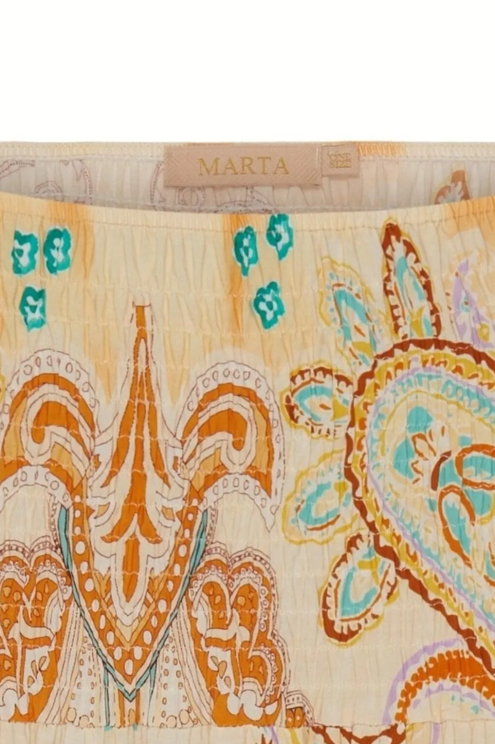 Beige nederdel fra Marta Du Chateau med paisleymønster i orange og turkise nuancer. Den har flæser og en høj talje med elastik, der giver god bevægelsesfrihed.