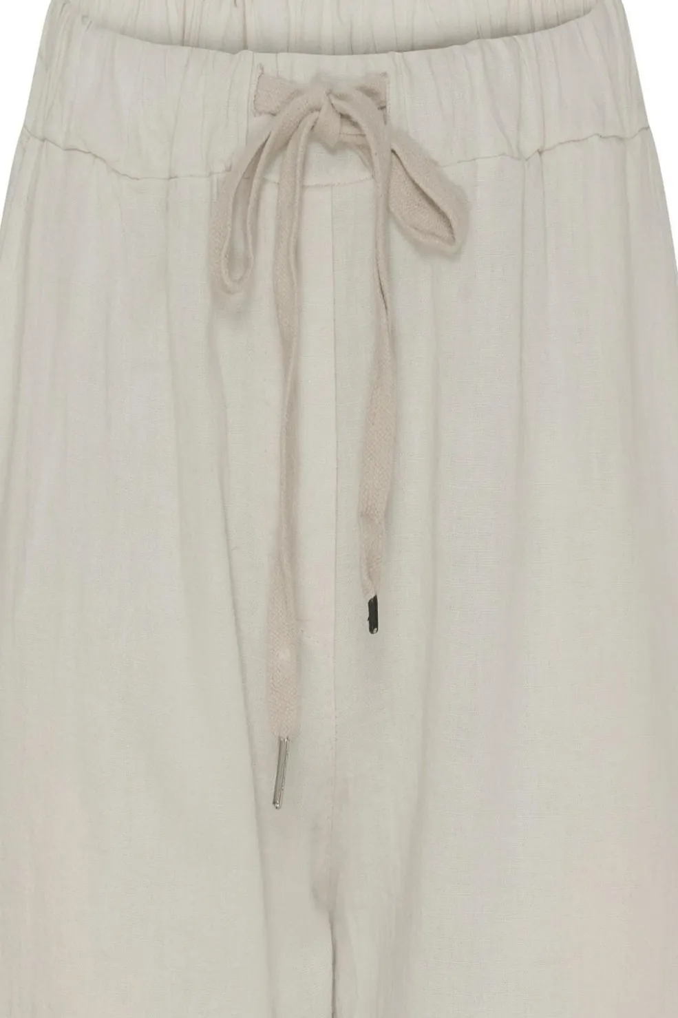 Beige bukser i lækkert stof med snøre og elastik i taljen. Bukserne har en lige pasform og går til midt på læggen. To praktiske baglommer giver bukserne et afslappet udtryk.