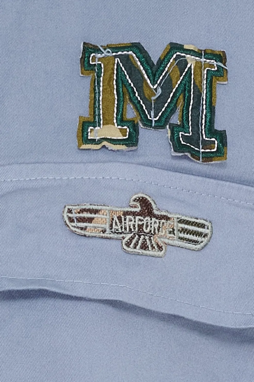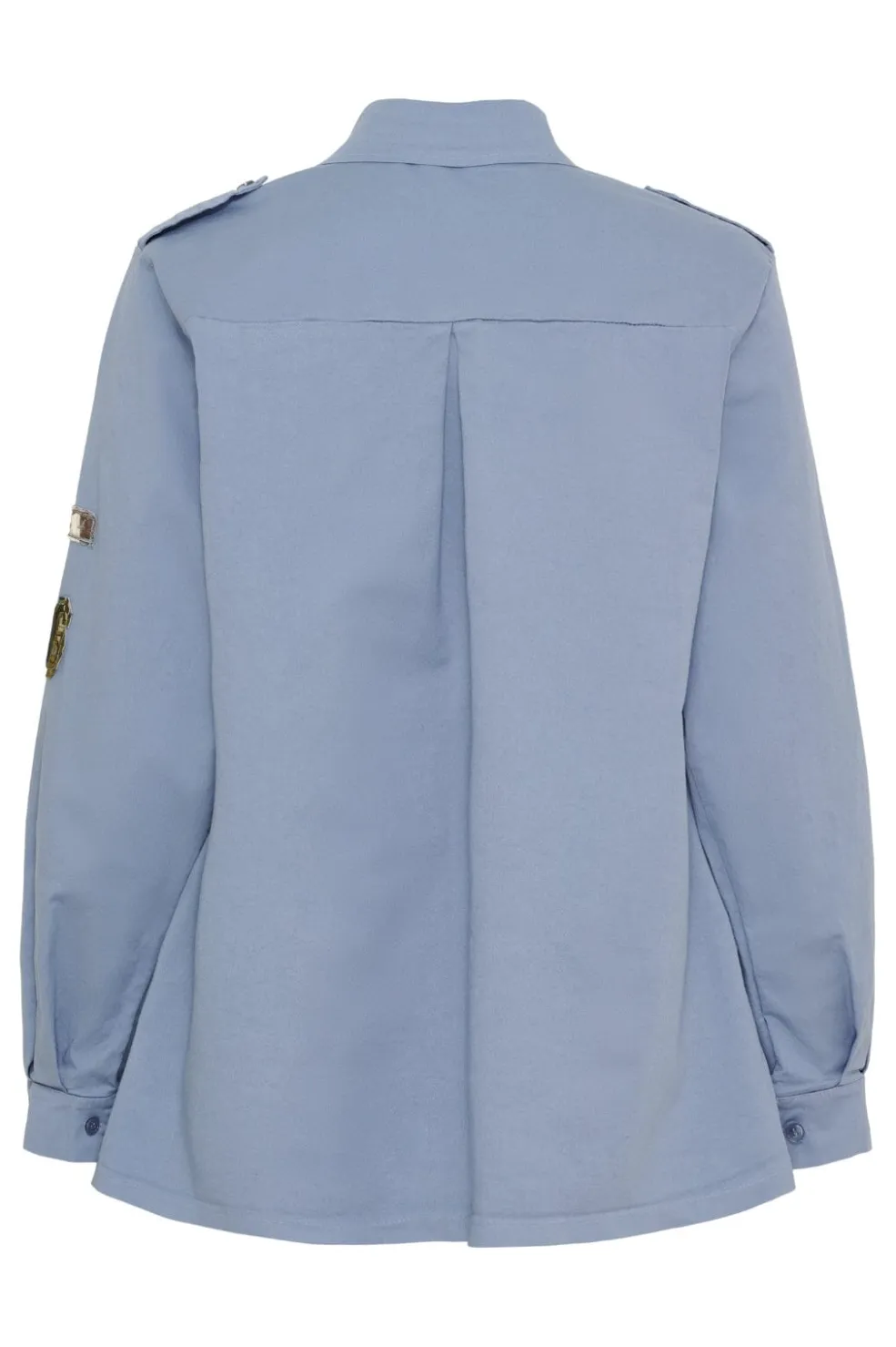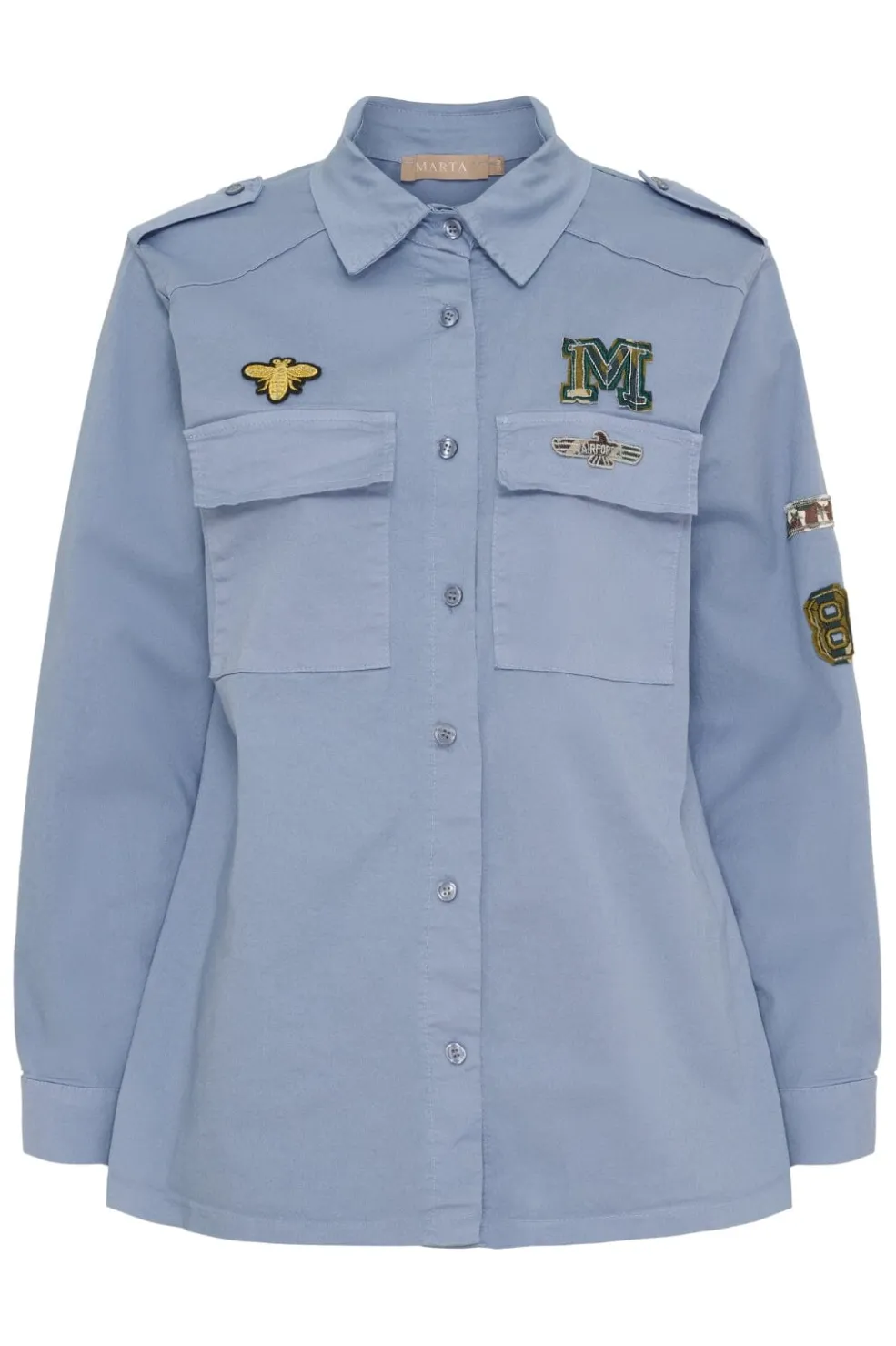 Lys blå jakke fra Marta Du Chateau med skjortekrave og knaplukning. To brystlommer og broderede emblemer giver jakken et militærinspireret udtryk.