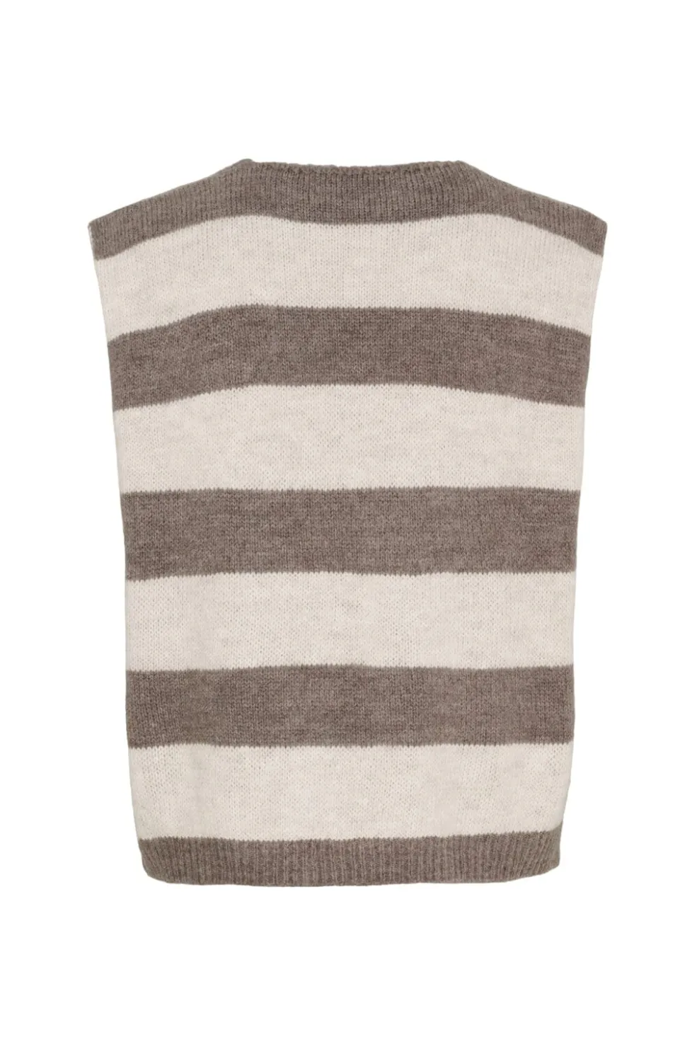 Strikket vest fra Marta Du Chateau med brune og hvide striber. De lyseblå hjerter på de hvide striber skaber et legende mønster. Vesten har V-hals og bindebånd foran.