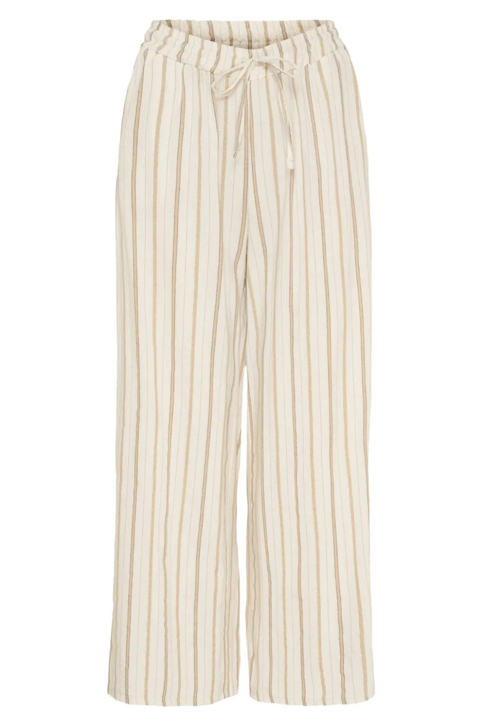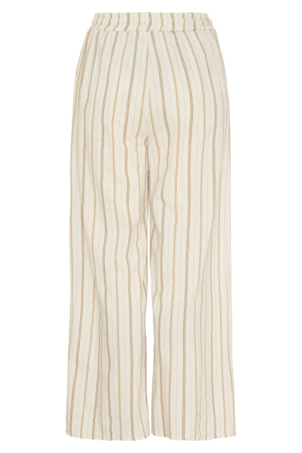 Stribede bukser fra Marta Du Chateau i lys beige med brune striber. Bukserne har en løs pasform med ankellængde og en kombination af snøre og elastik i taljen.