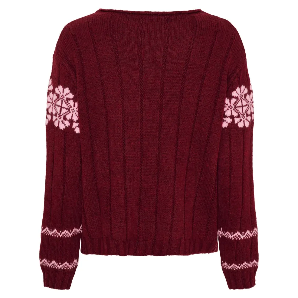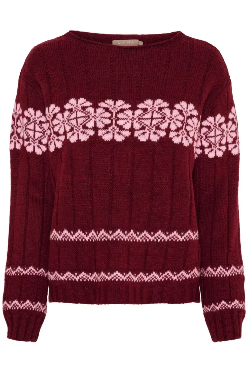 Striktrøje fra Marta Du Chateau i bordeaux med lyserøde blomstermønstre og geometriske striber. Trøjen har rund hals og lange ærmer.