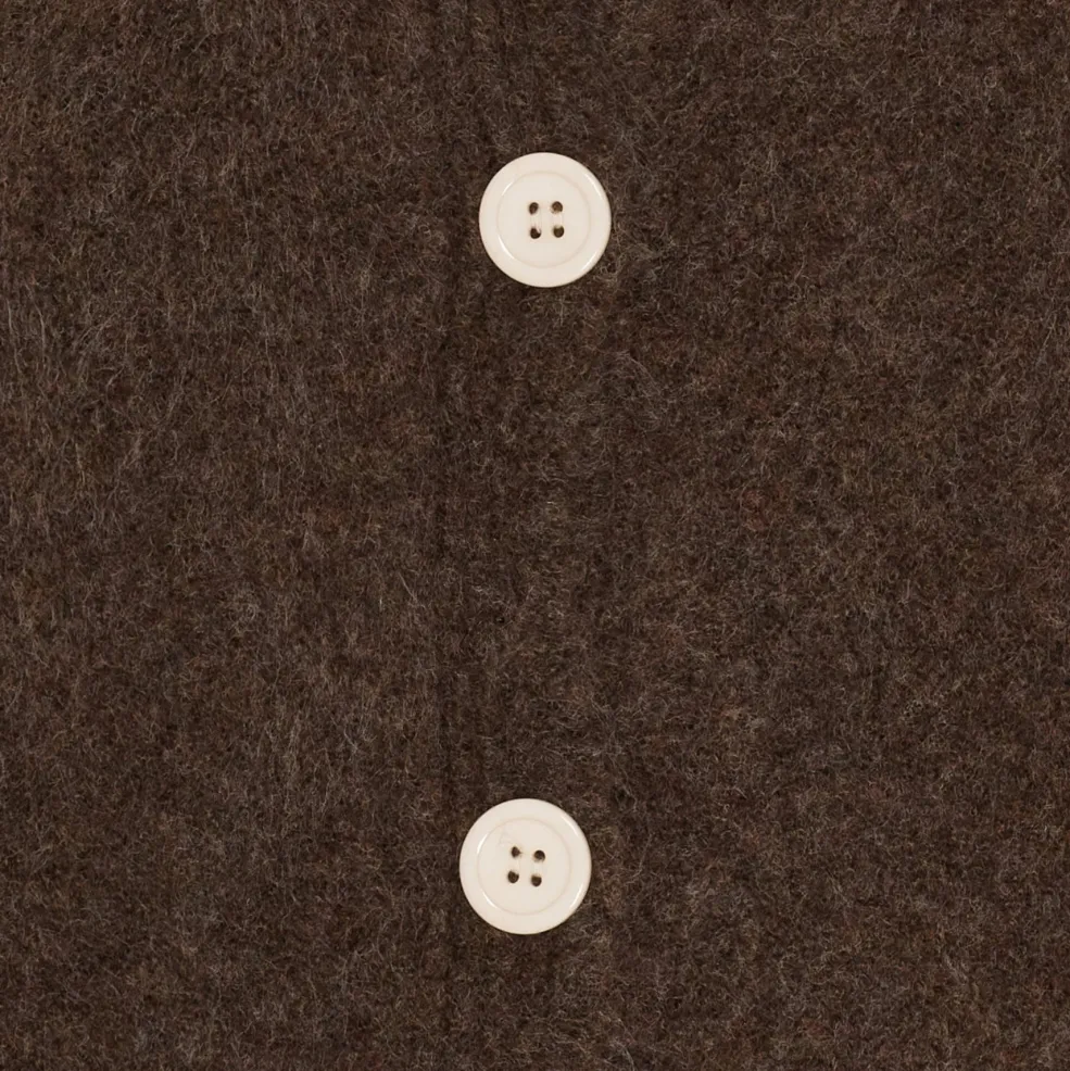 Brun striktrøje fra Marta Du Chateau med beige manchetter og knapper langs fronten. Et lille hjertemotiv sidder på venstre side af brystet.