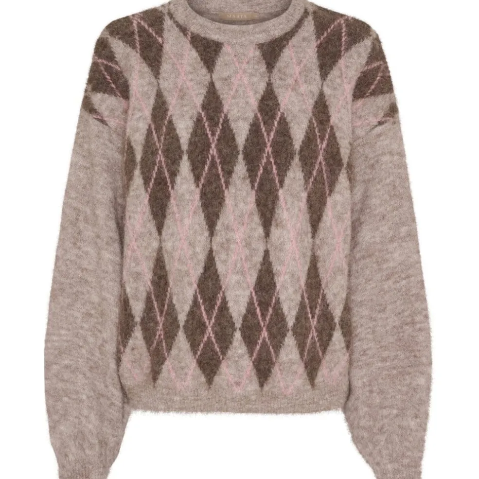 Striktrøje fra Marta Du Chateau i beige og rosa med et ternet mønster. Trøjen har en rund hals og lange ærmer.