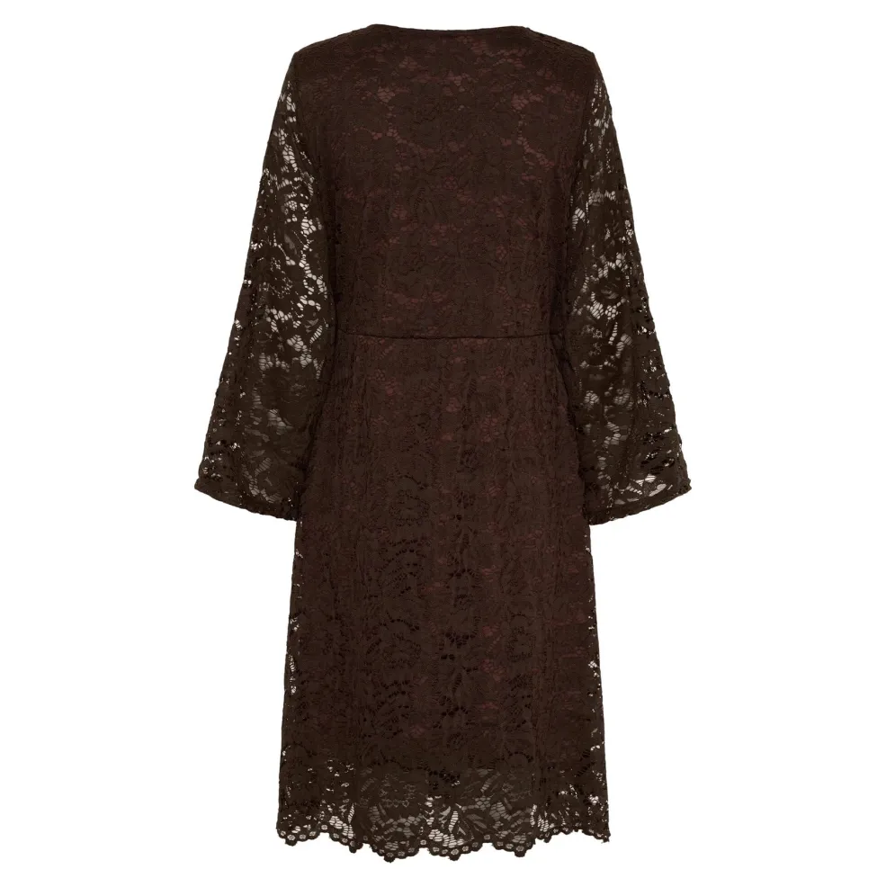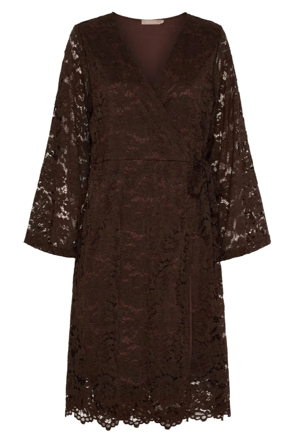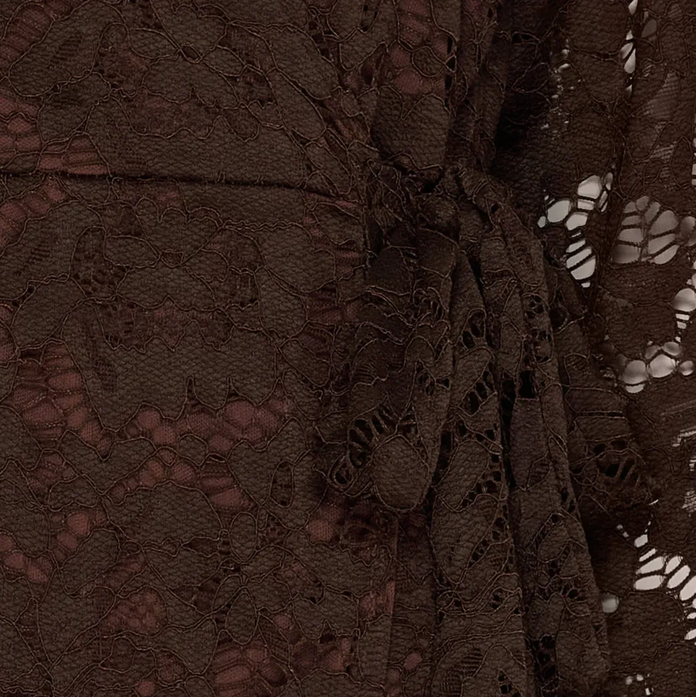 Brun knælang kjole fra Marta Du Chateau med blondeoverflade. Kjolen har V-udskæring og 3/4-ærmer samt bindebånd i siden, der giver en slankende snitføring.
