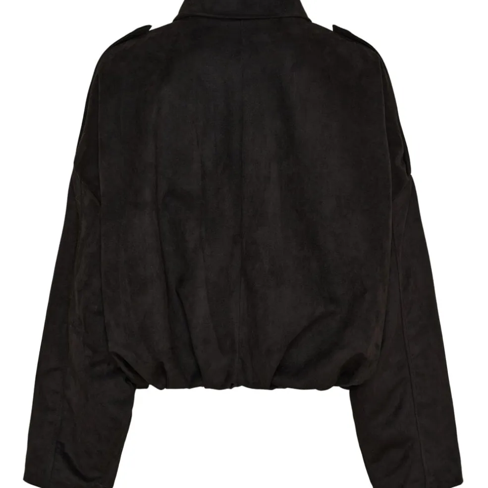 Sort jakke fra Marta Du Chateau med klassisk krave og skjult lukning foran. Jakken har epaulet-detaljer på skuldrene og dekorative syninger.