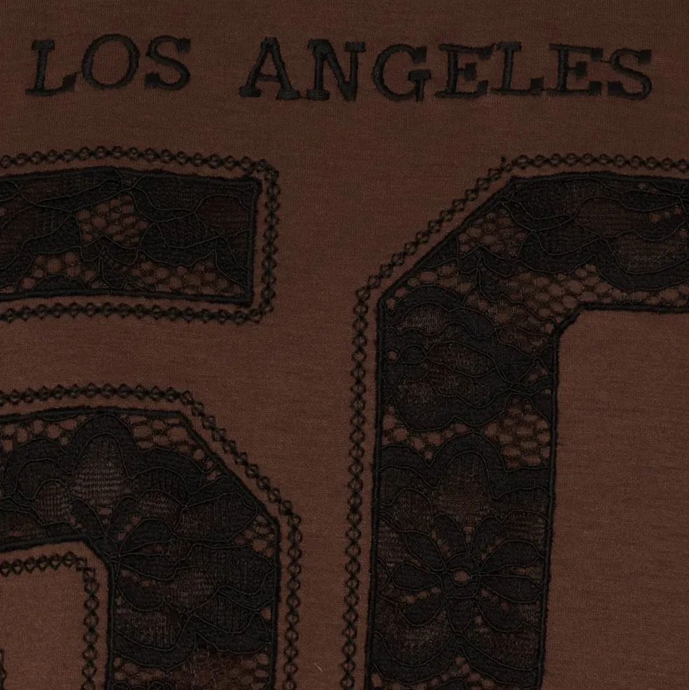 Mørkebrun sweatshirt fra Marta Du Chateau med sort blondedetalje. Sweatshirten har LOS ANGELES 50 print på forsiden og en rund halsudskæring.