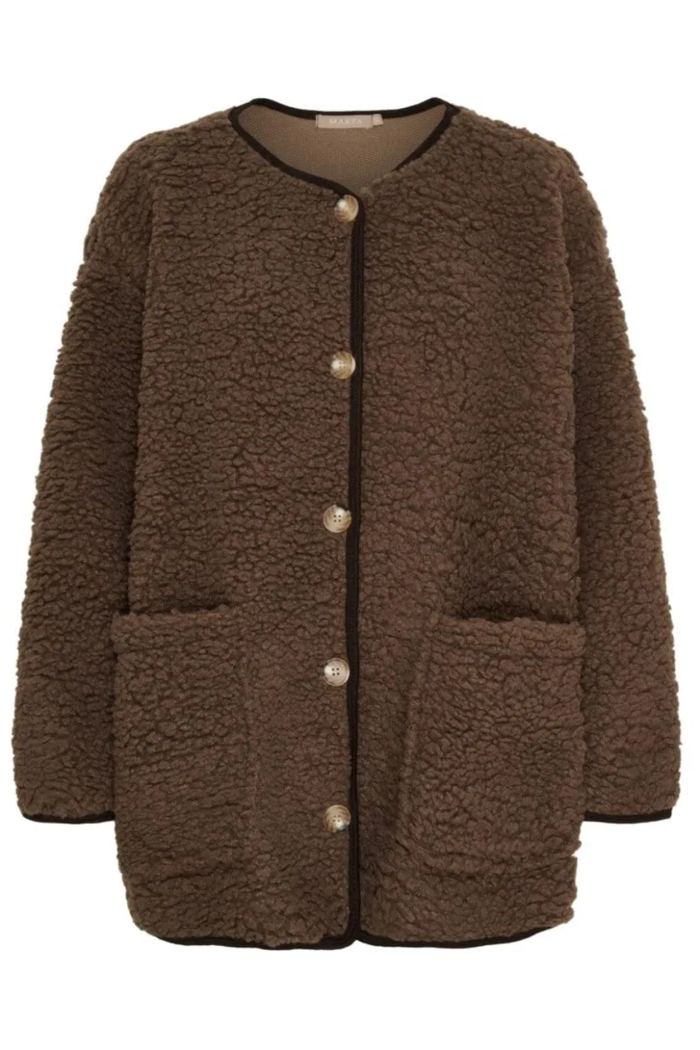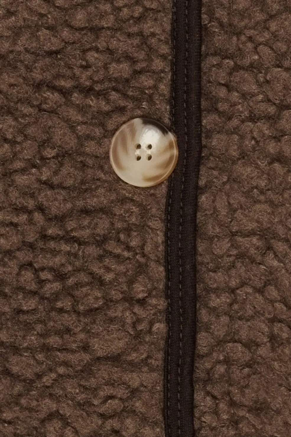 Brun jakke fra Marta Du Chateau med en overflade, der ligner teddy. Jakken har knapper foran og store lommer.