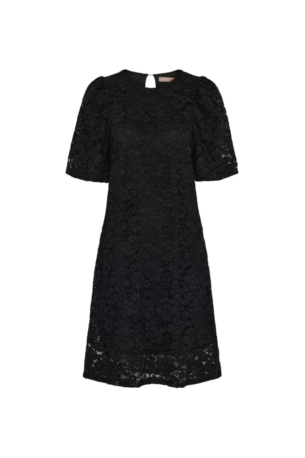Sort knælang kjole fra Marta Du Chateau med blomsterblondemønster. Kjolen har puffede ærmer, rund hals og knaplukning i ryggen.