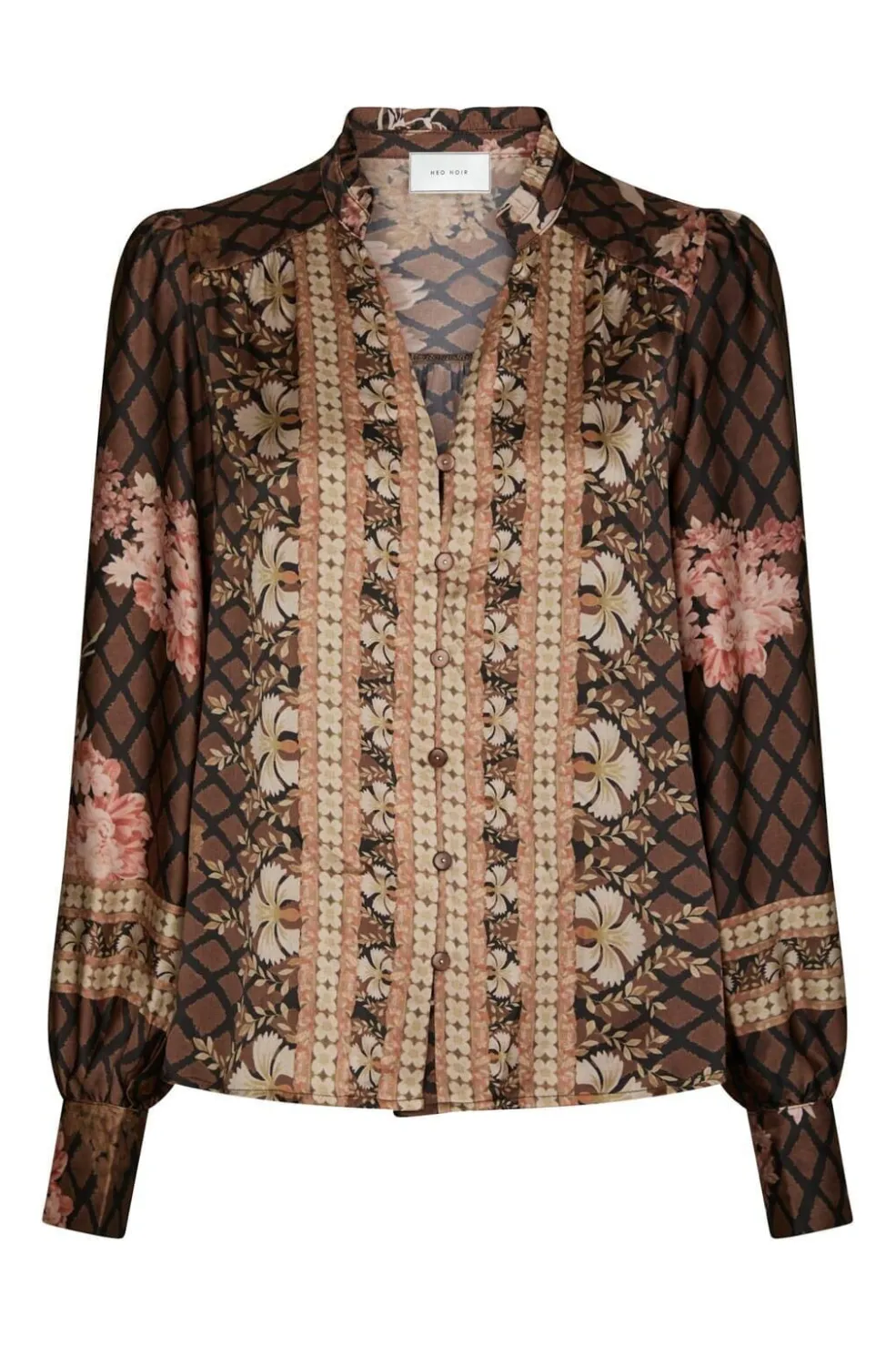 Sort bluse fra Neo Noir med blomsterprint i pink og jordfarver. Blusen har V-udskæring med knaplukning foran og lange ærmer med flæsedetaljer.