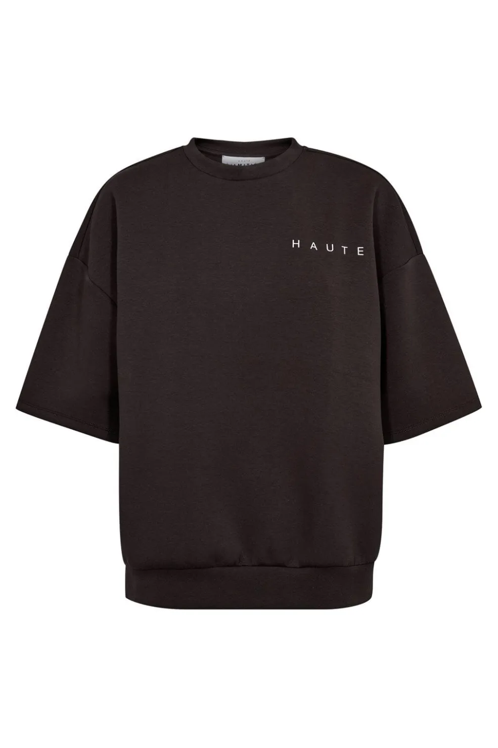 Sweatshirt fra Haute L’Amitié i antracit. Sweatshirten har korte ærmer og et trykt logo på brystet med teksten HAUTE.