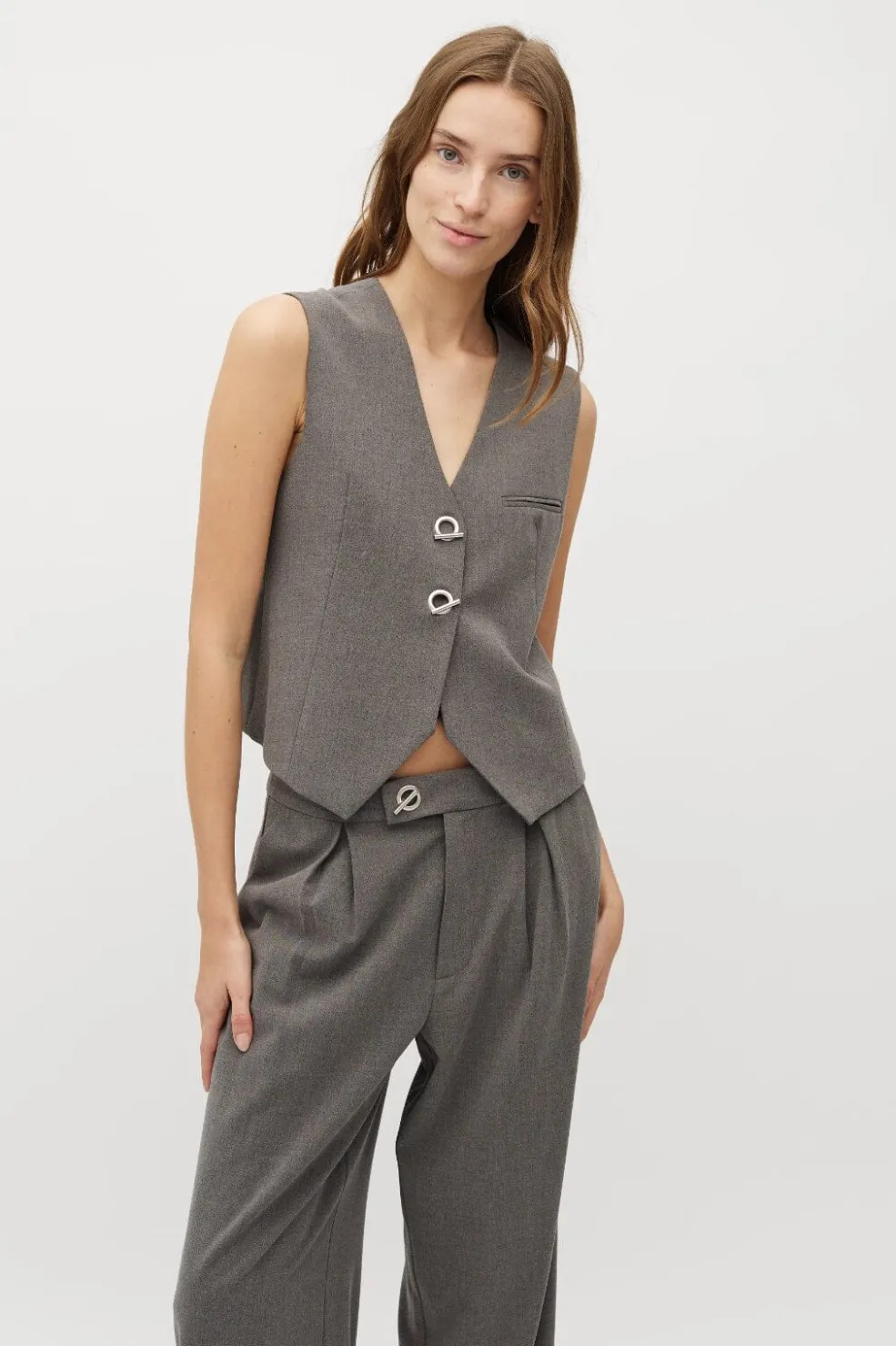 Vest fra MbyM i grå farve med meleret mønster. Vesten kan bæres til både formelle anledninger, hverdagsbrug og festlige lejligheder.