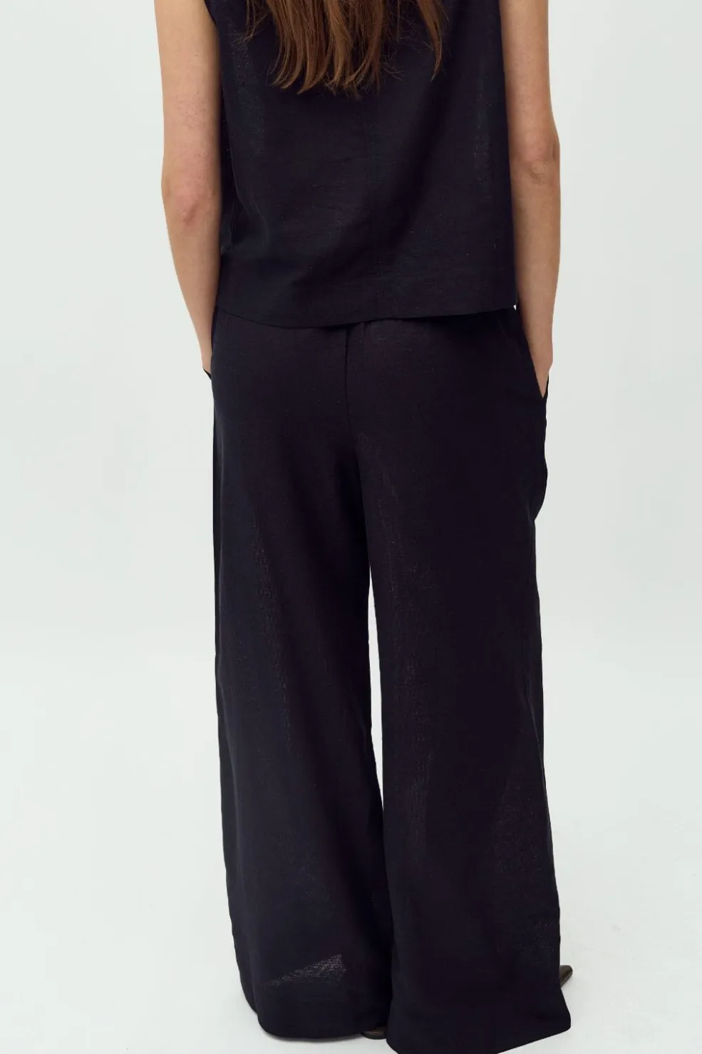 Sorte bukser fra MbyM med vide ben og læglang længde. Bukserne har en elastisk talje og sidelommer, hvilket gør dem praktiske til hverdagsbrug.
