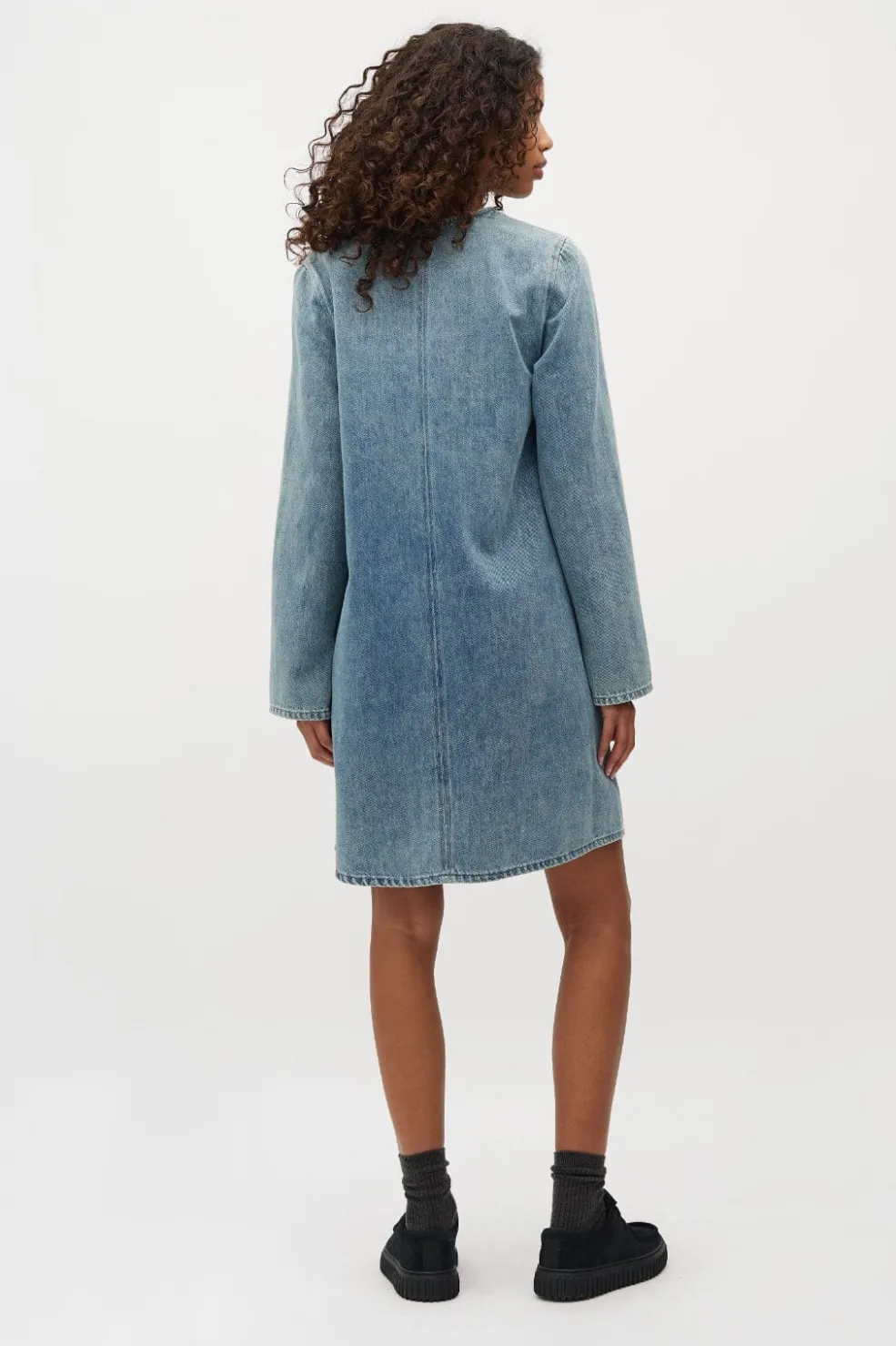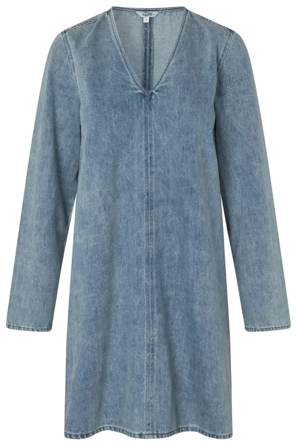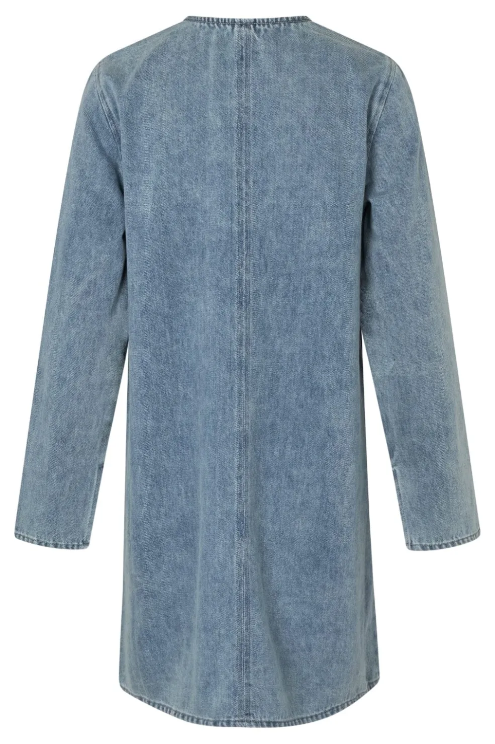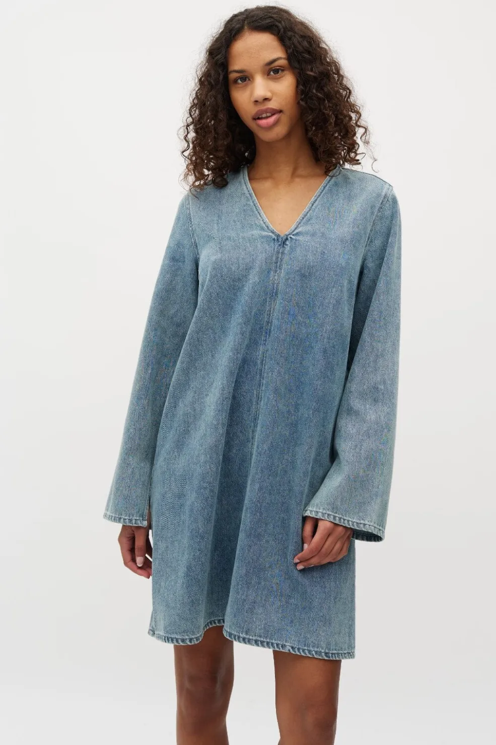 En blå kjole fra MbyM med en soft wash-effekt. Den har v-udskæring, lange ærmer og en længde til midt på låret.