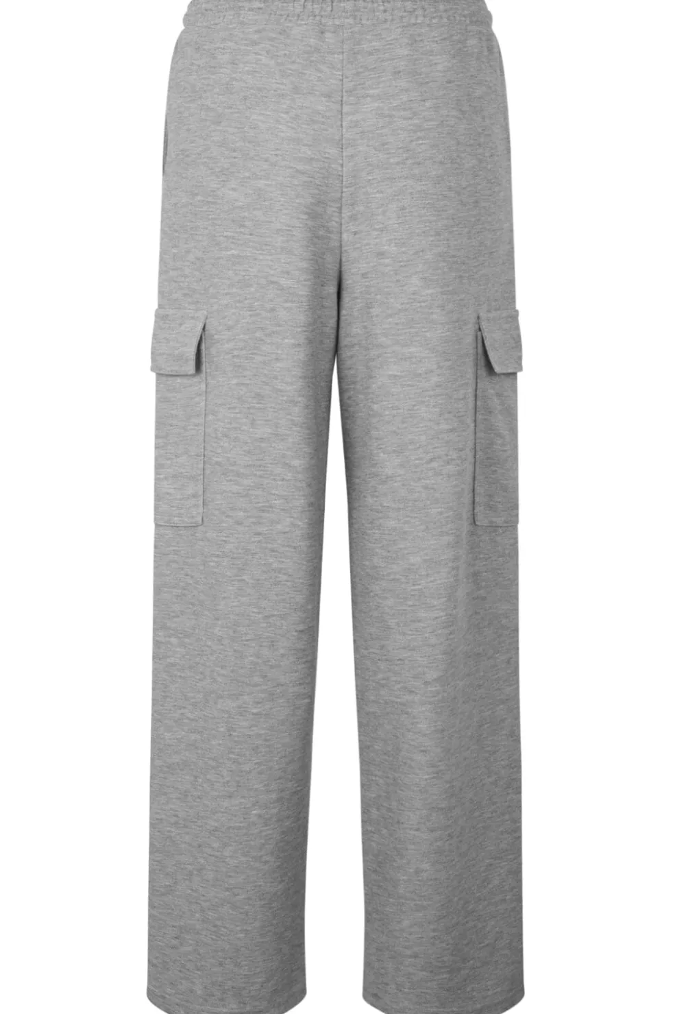 Grå sweatpants fra MbyM med cargo-lommer på siderne. Bukserne har en regulær pasform og gulvlængde. Snørelukningen i taljen giver mulighed for at justere vidden.