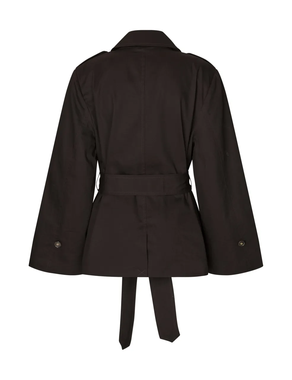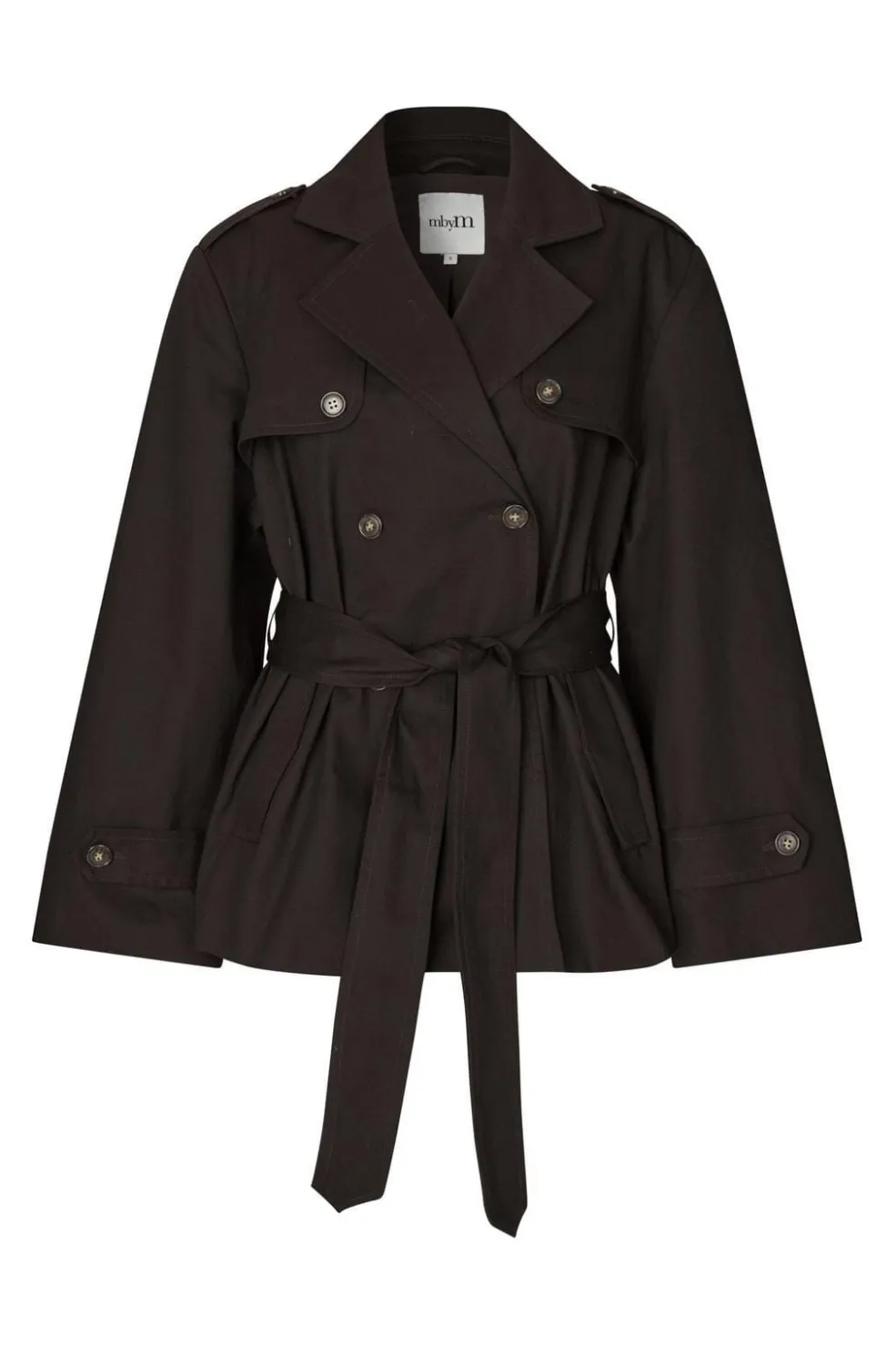 Brun jakke fra MbyM, lavet af bomuld. Jakken har et dobbeltknappet design med bælte i taljen og bindebåndsdetaljer.