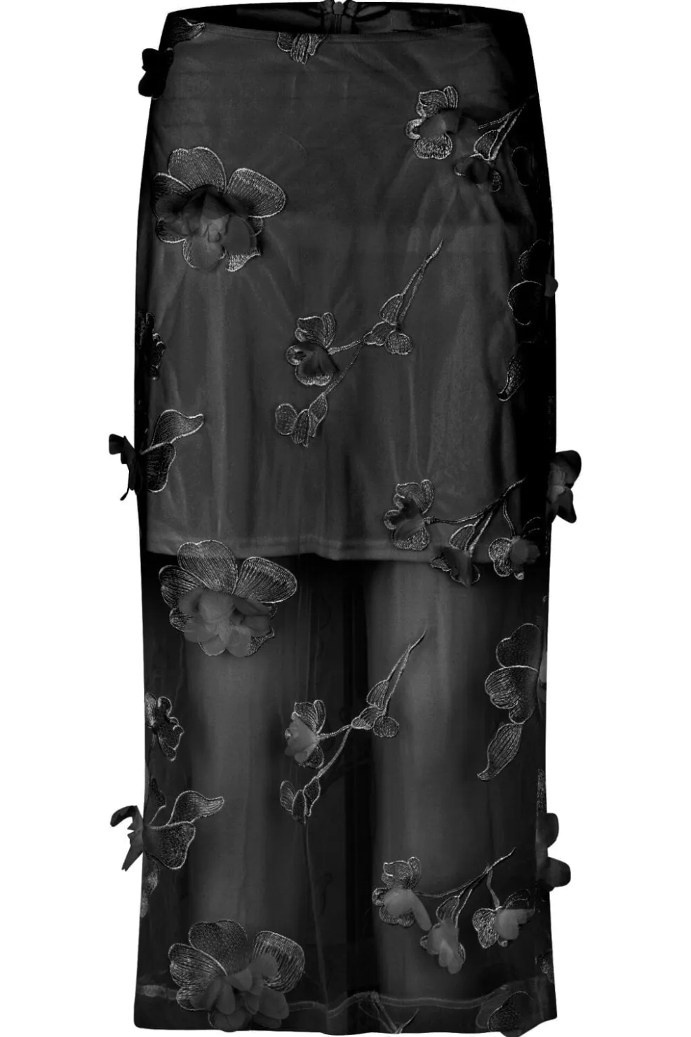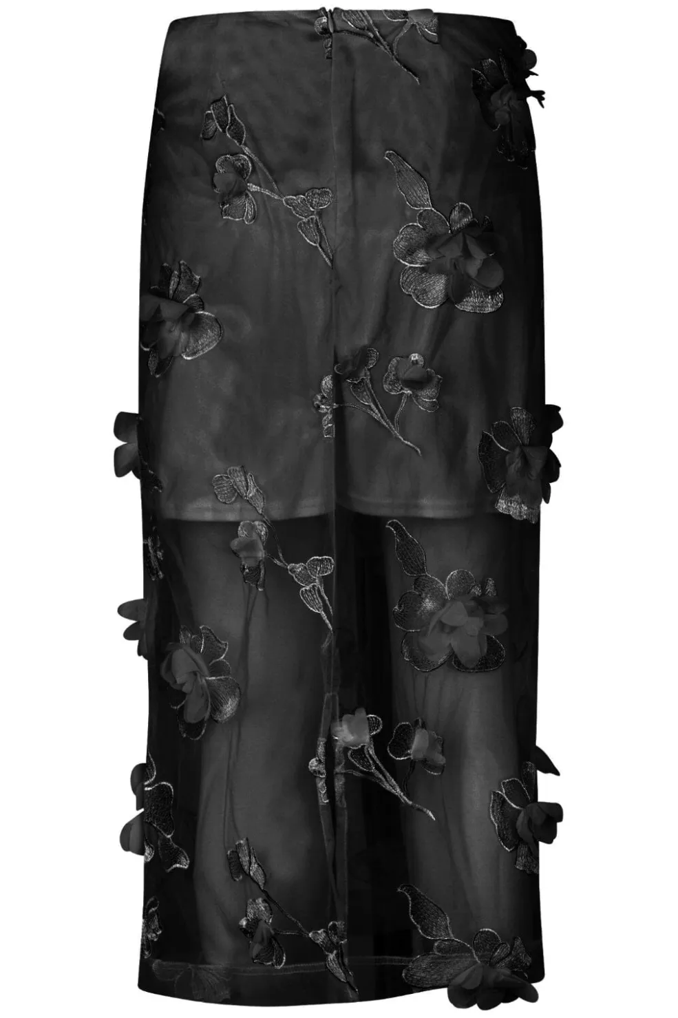 Sort nederdel med transparent overlay og blomsterbroderi. Det gennemsigtige stof har et detaljeret mønster af broderede blomster, og nederdelen når til midt på læggen.