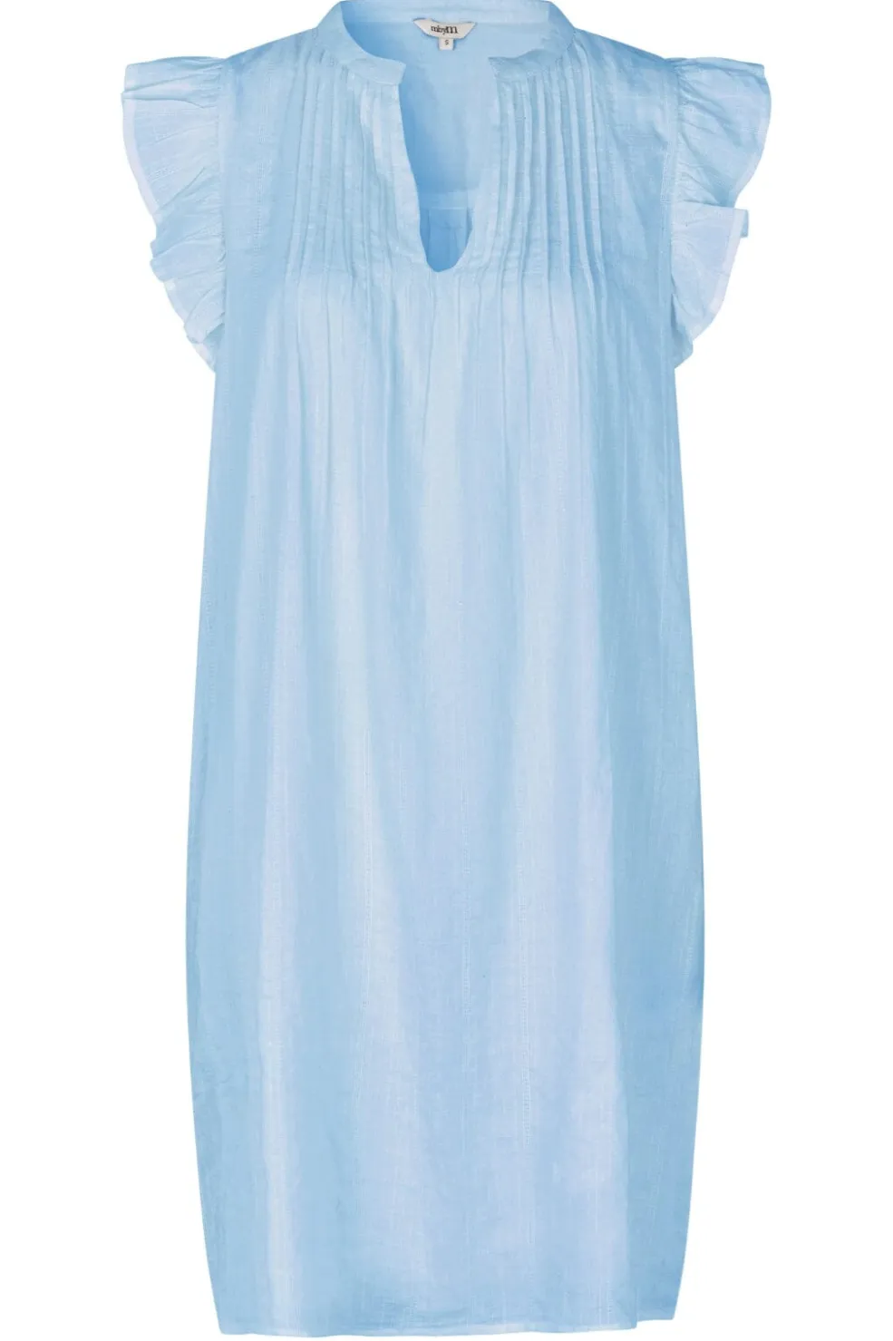 Lang kjole fra MbyM i lyseblå bomuld. Kjolen har V-hals, flæseærmer og dekorative plisseringer foran. Den lyseblå farve Blue Heron giver kjolen et sommerligt udtryk.