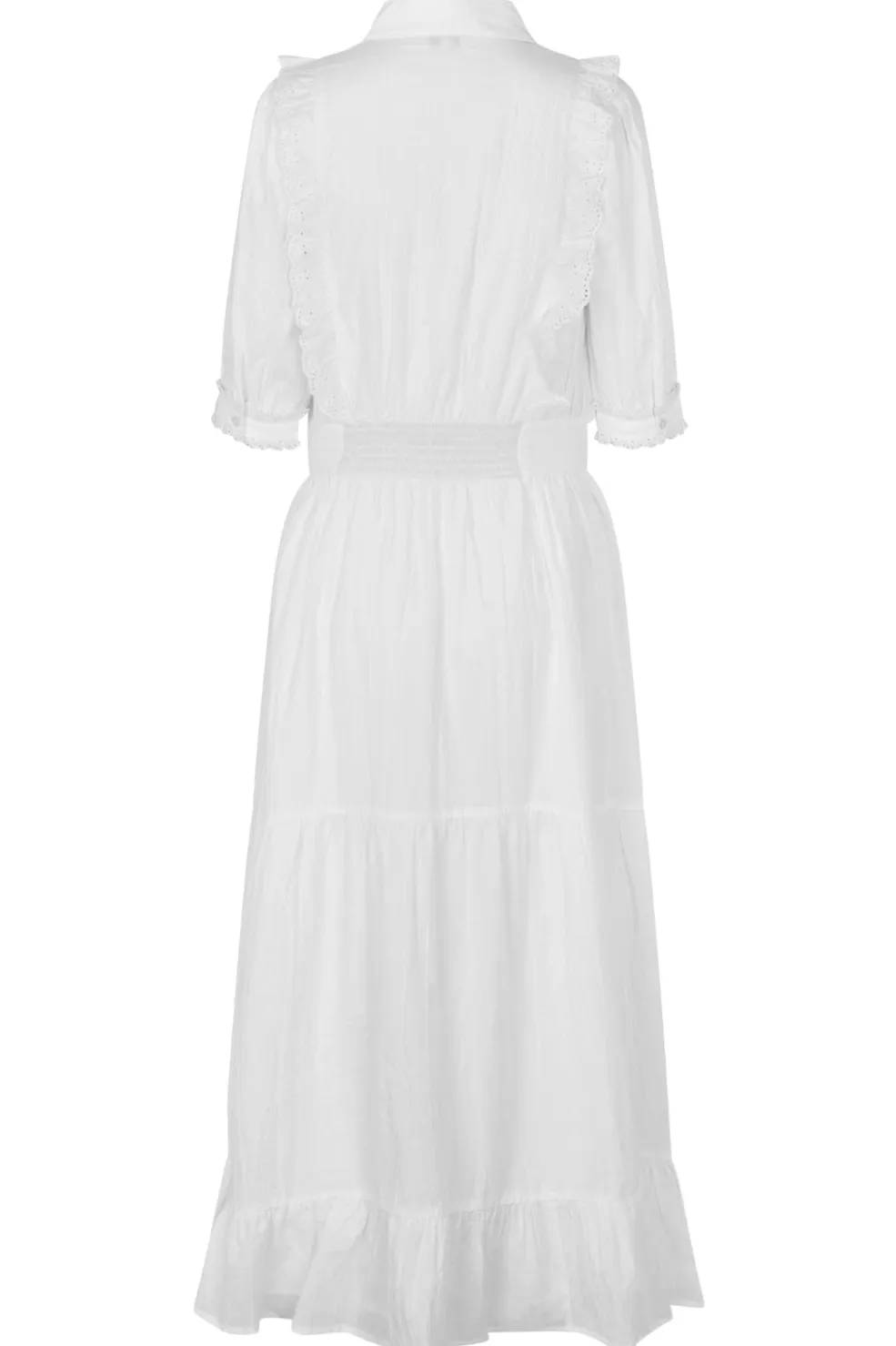 Hvid kjole fra MbyM med skjortekrave og korte ærmer. Kjolen har knaplukning foran og fine flæser langs kraven og ærmerne. Den trinvise nederdel går til midt på læggen.