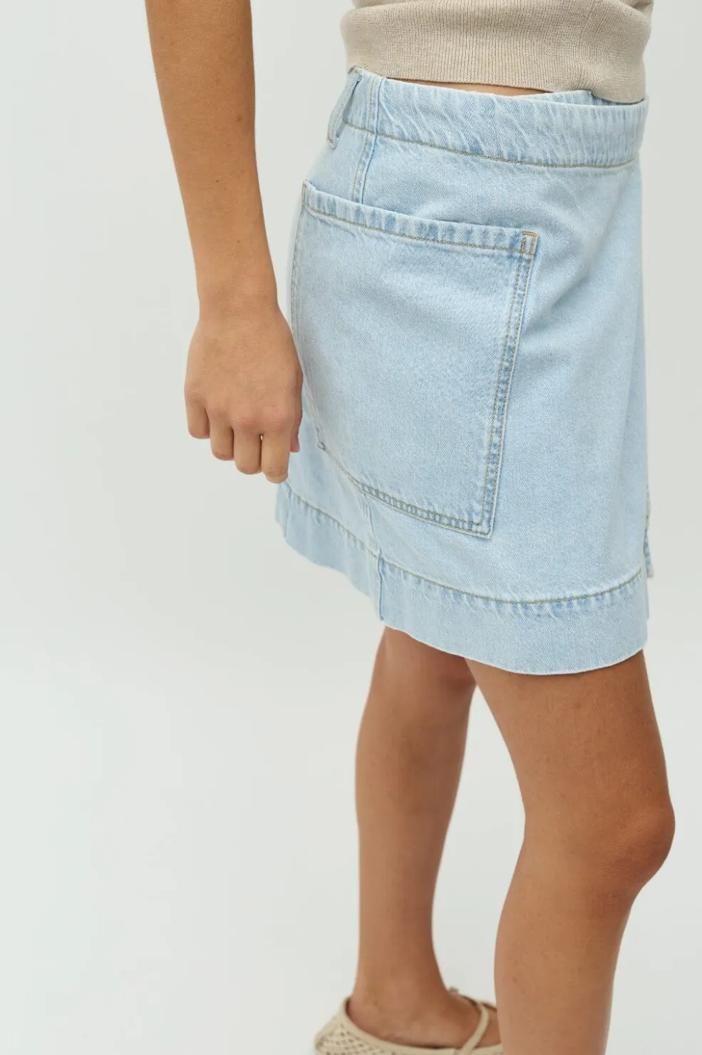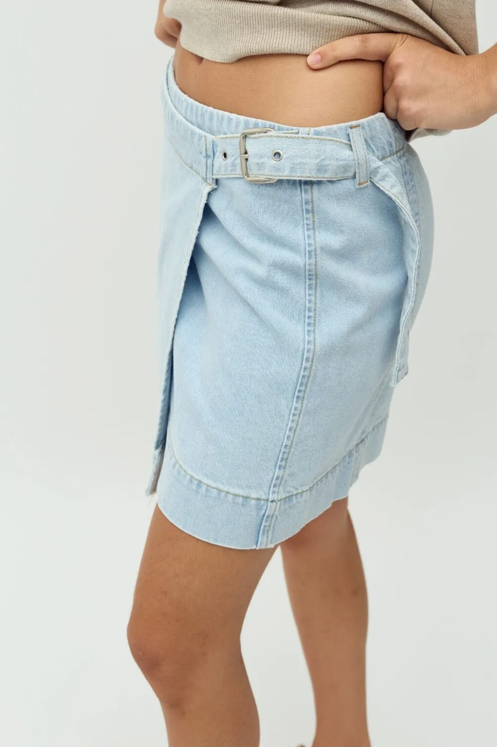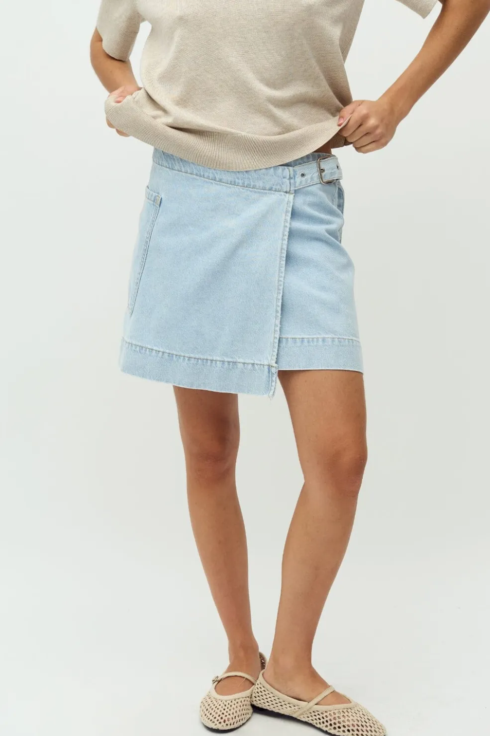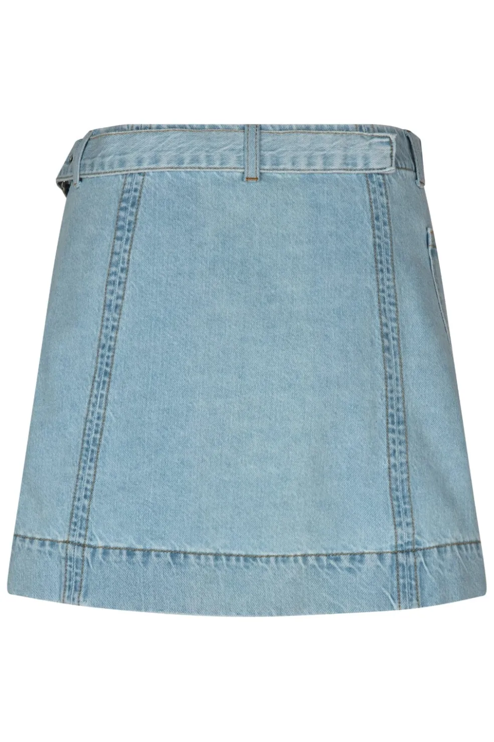 Denimnederdel fra MbyM i en lys blå vask. Nederdelen har et omslagsdesign med spænde og en praktisk sidelomme. Den har en normal pasform og er fremstillet af denim.