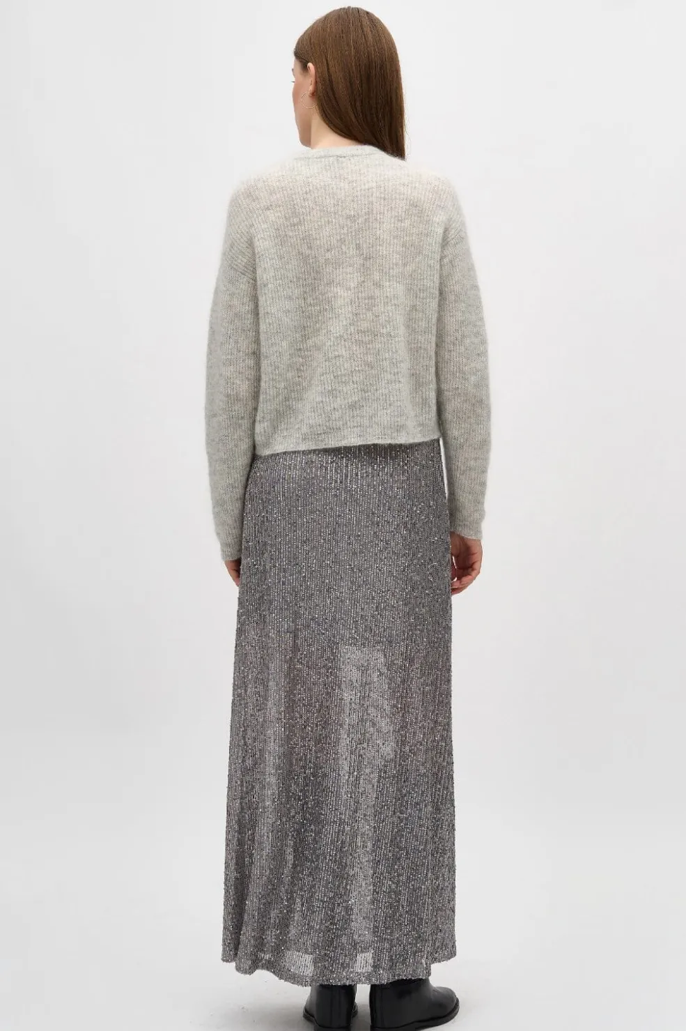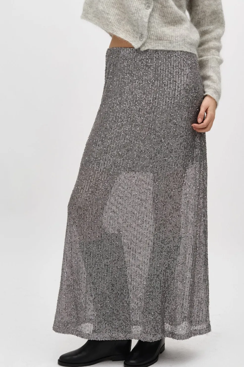 Sølvgrå nederdel fra MbyM med pailletter over det hele. Nederdelen har ankellængde og elastik i taljen. Den grå nuance passer godt til festlige anledninger.