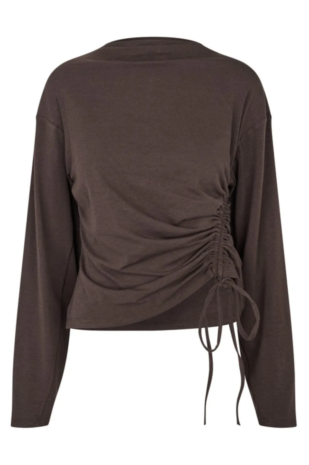 Mørkebrun langærmet top fra MbyM med asymmetrisk rynket detalje på siden. Toppen har justerbare snore og en rund halsudskæring.