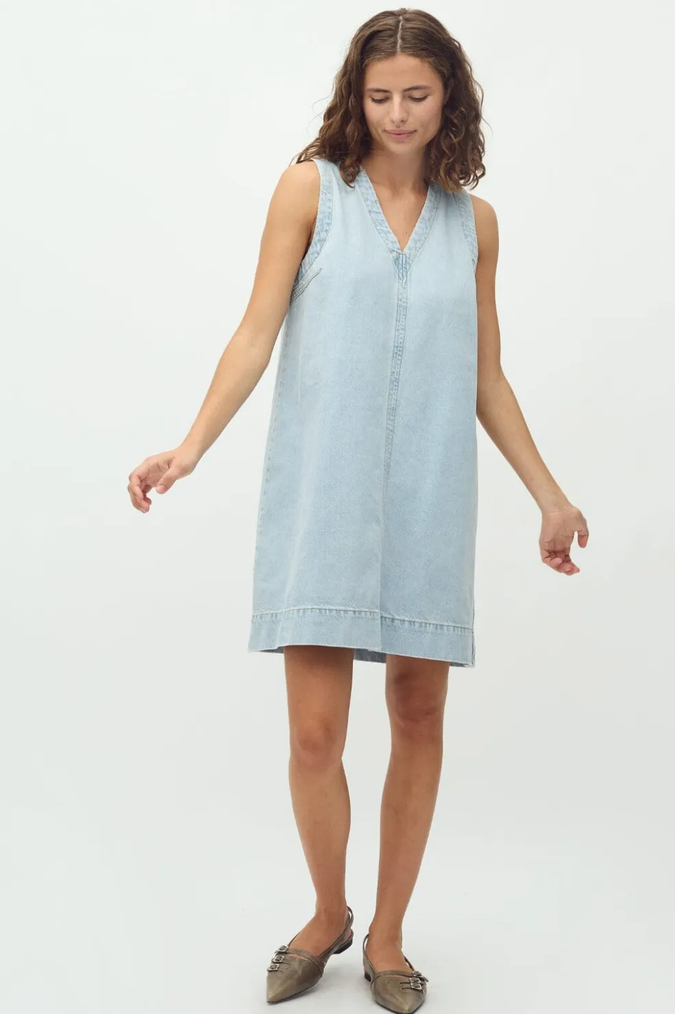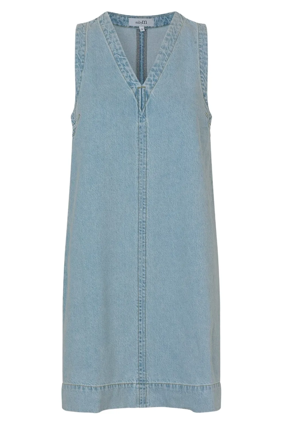 Ærmeløs denimkjole fra MbyM i en lys blå vask. Kjolen har en V-udskæring og en lige pasform, der falder til låret. Den lyseblå vask giver et friskt præg.
