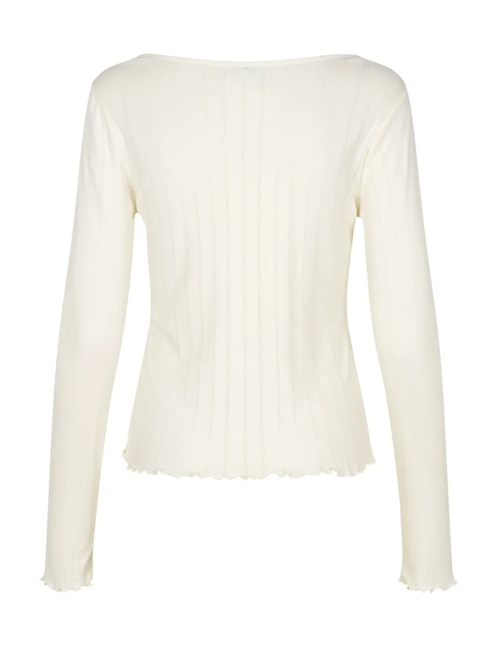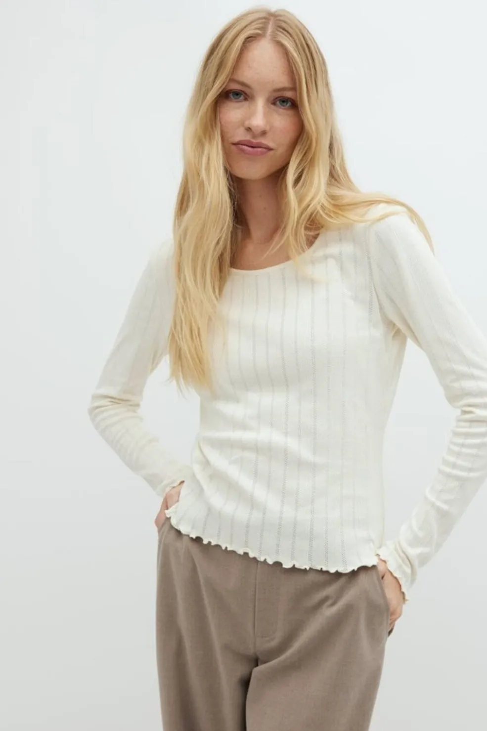 Langærmet top fra MbyM i økologisk bomuld. Toppen har en lys cremehvid farve og en løs pasform med ribbet tekstur samt frynsede kanter ved ærmerne og bunden.