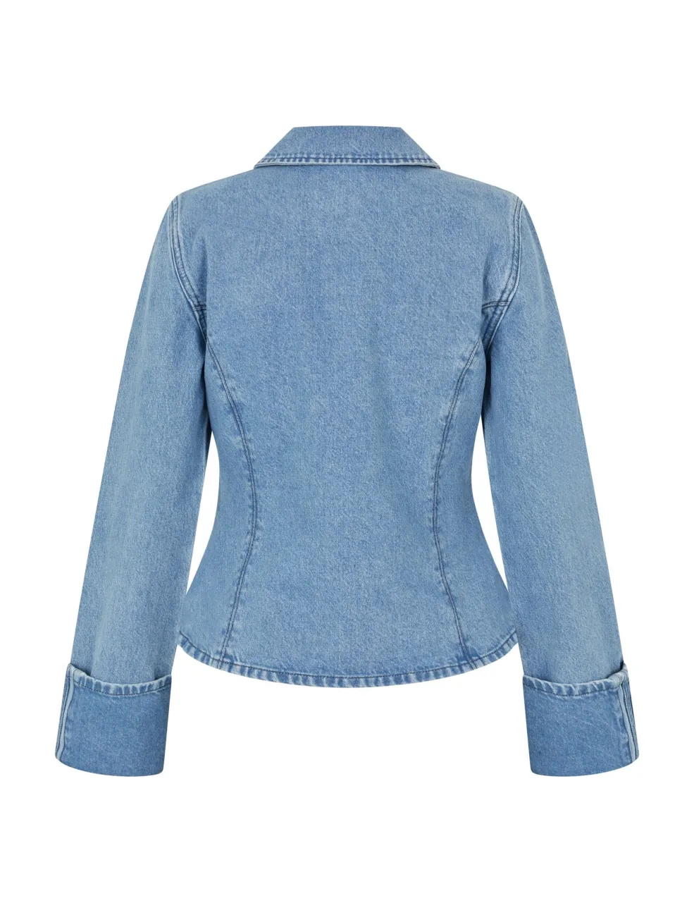 Denimjakke fra MbyM i en lys blå vask. Jakken har en slim fit-pasform med skjortekrave og knapper hele vejen ned. De dekorative syninger giver jakken et gennemført udtryk.