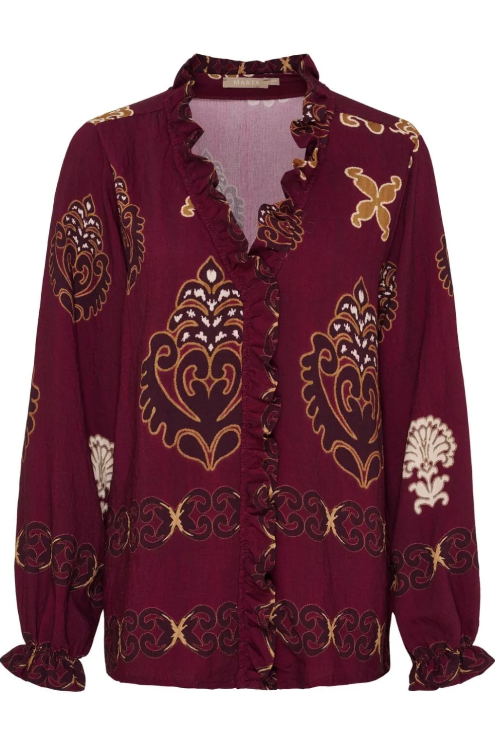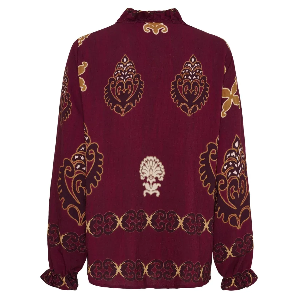 Bordeaux skjorte fra Marta Du Chateau med paisley- og blomstermønster. Skjorten har lange ærmer og en V-hals med flæsedetaljer langs knaplukningen foran.