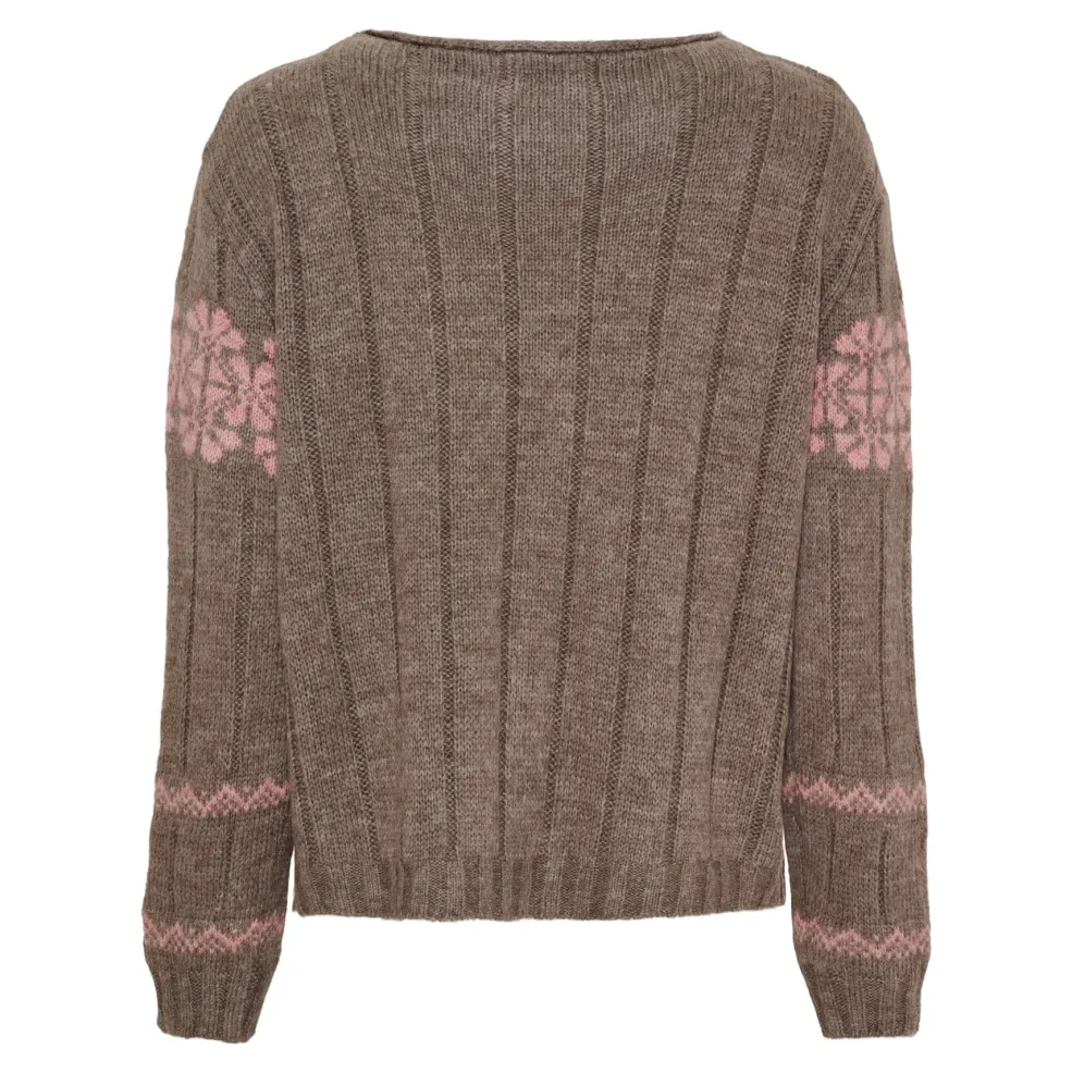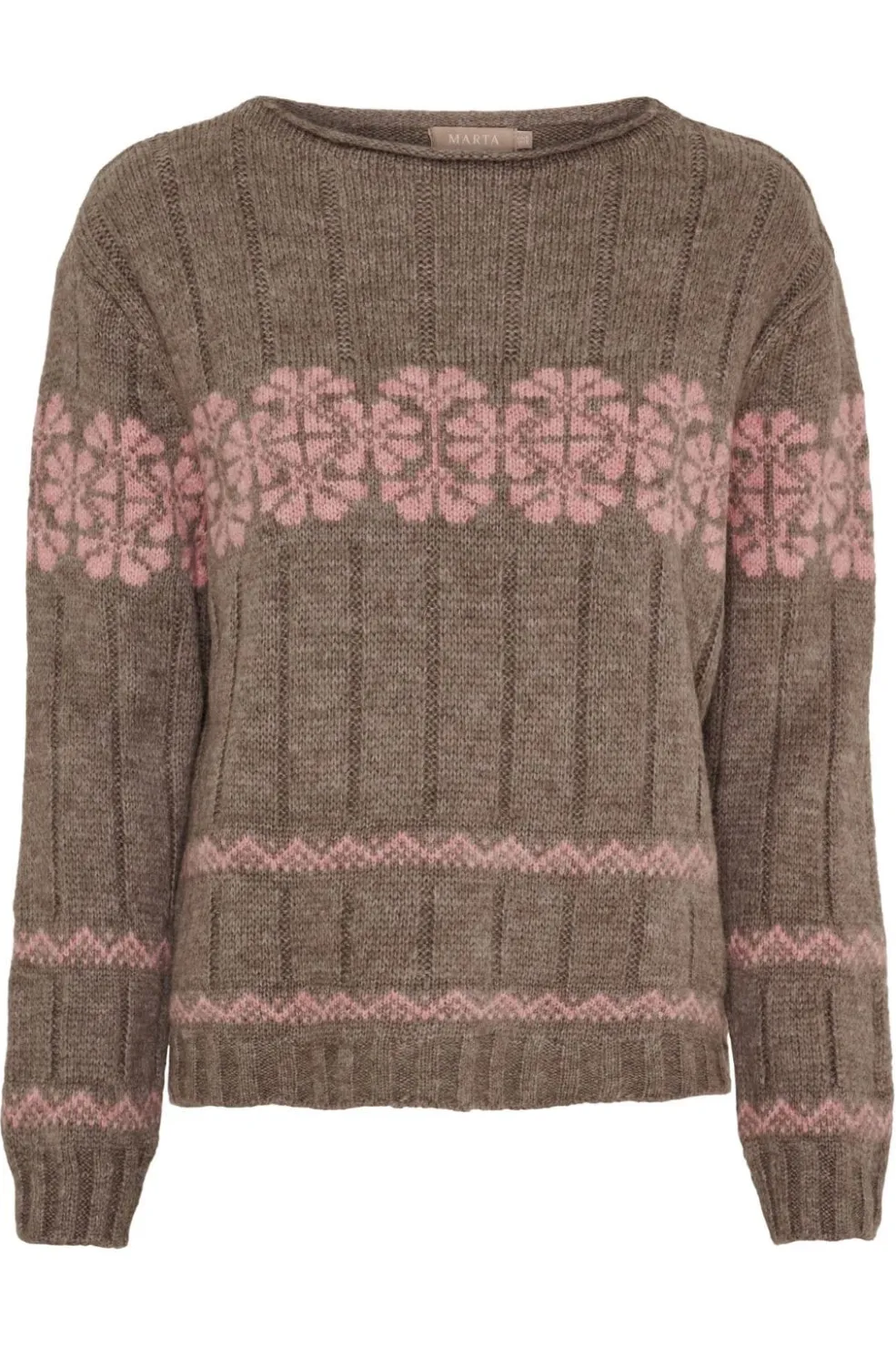 Striktrøje fra Marta Du Chateau i brun med lyserøde blomstermønstre. Trøjen har en klassisk rund hals og lange ærmer med ribkant ved ærmerne og bunden.