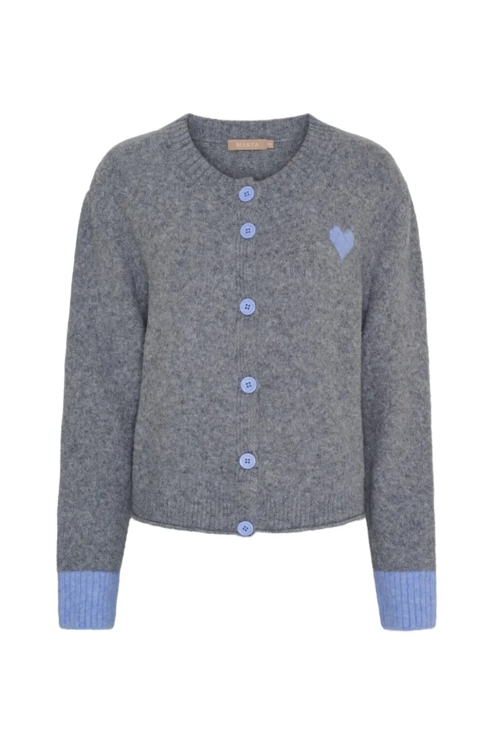 Gråblå cardigan fra Marta Du Chateau med blå knapper foran og et hjerteformet emblem på venstre bryst. De blå ribstrikkede manchetter matcher knapperne.