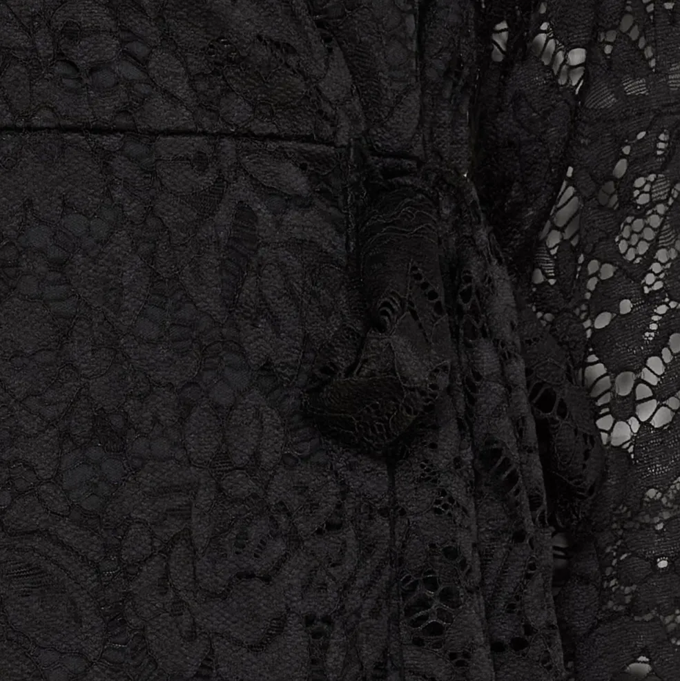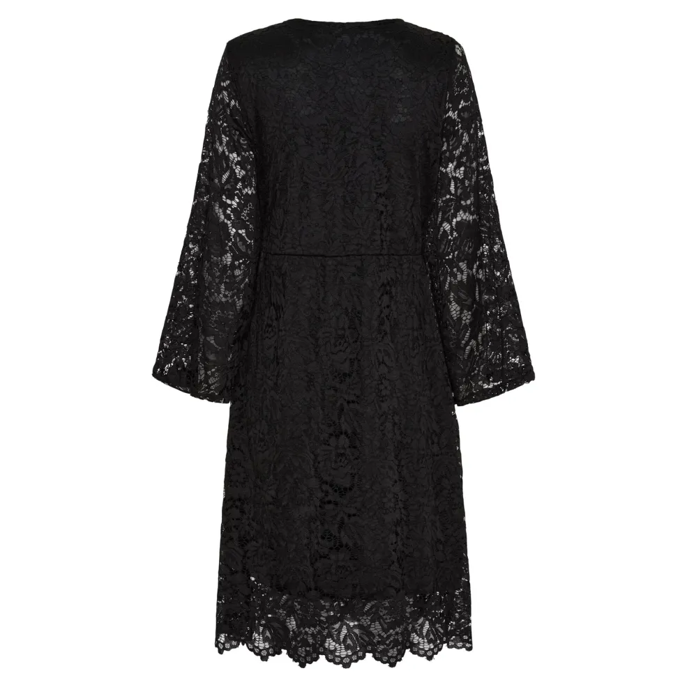 Sort knælang kjole fra Marta Du Chateau med blondedetaljer. Kjolen har en V-udskæring og bindebånd i taljen, der giver mulighed for at tilpasse pasformen.