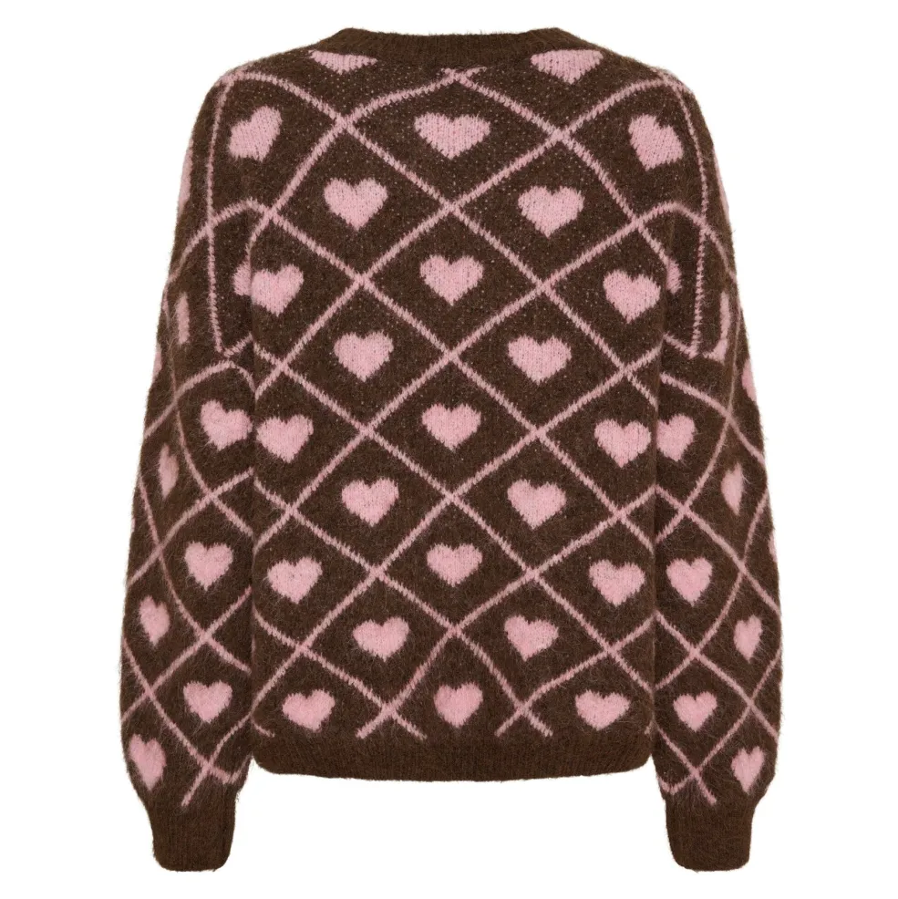 Brun striktrøje fra Marta Du Chateau med lyserøde hjerter i ternmønster. Trøjen har rund hals og lange ærmer, der giver god varme til de kølige dage.