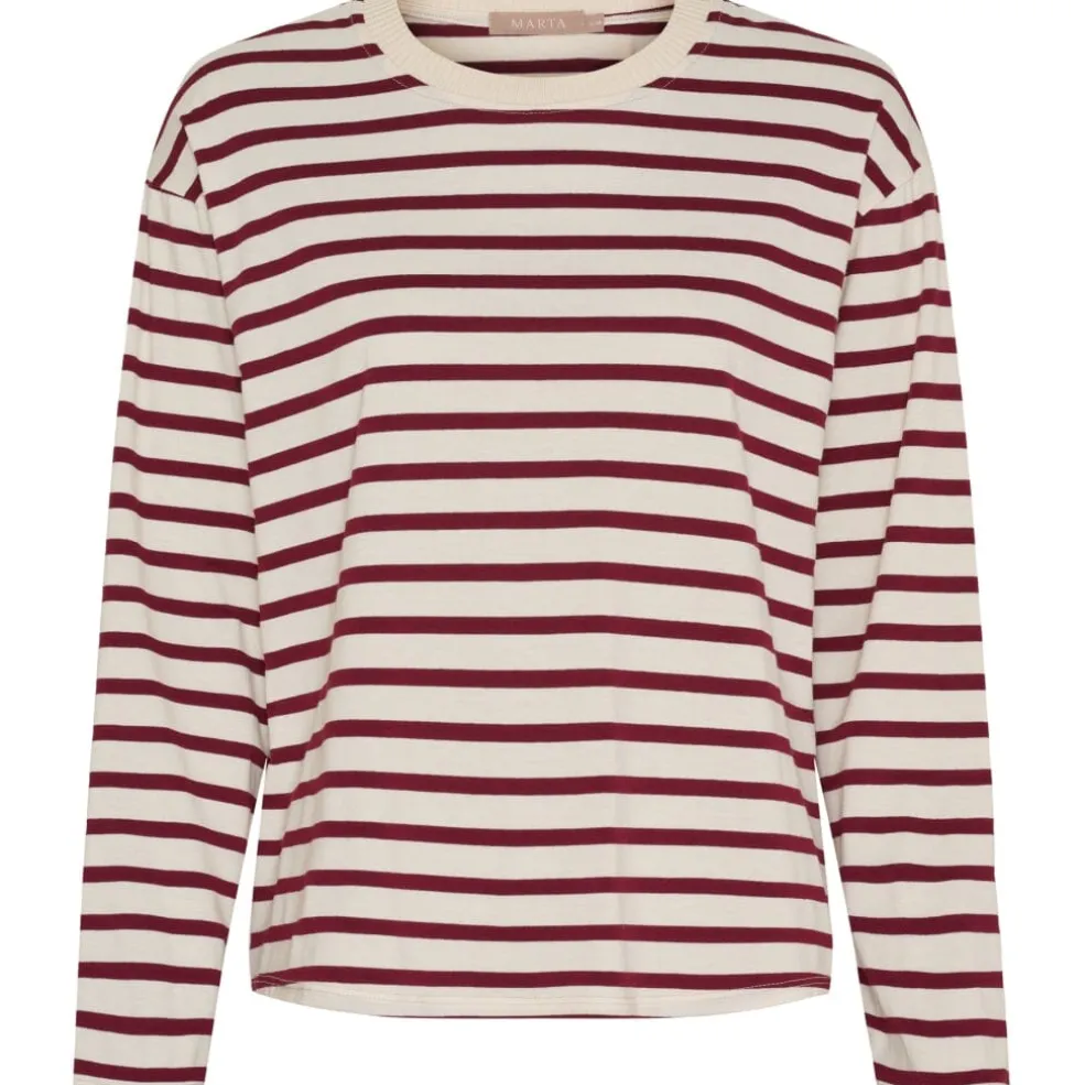 Langærmet t-shirt fra Marta Du Chateau med bordeaux og cremehvide striber. T-shirten har en rund halsudskæring og en løs pasform.