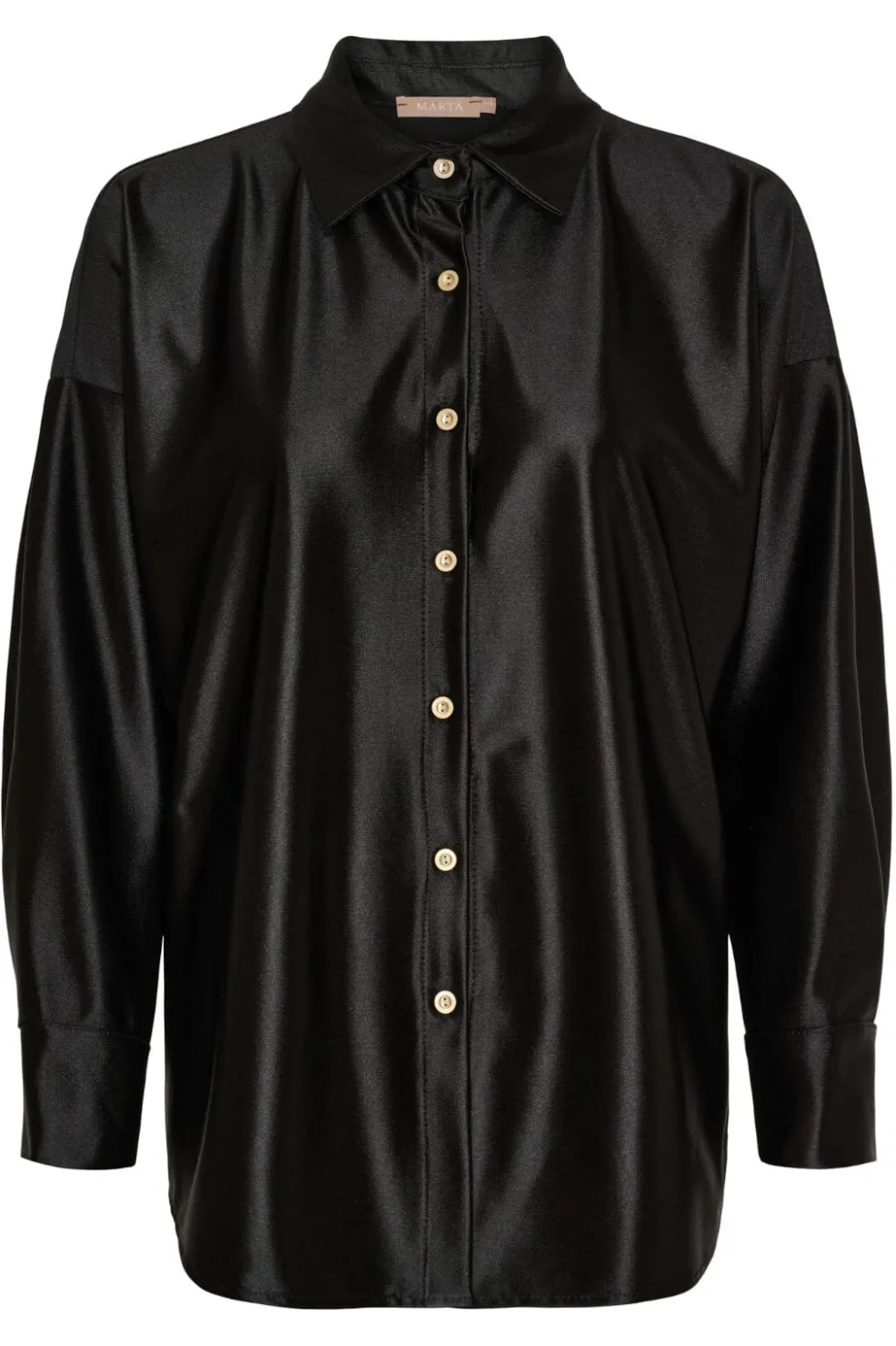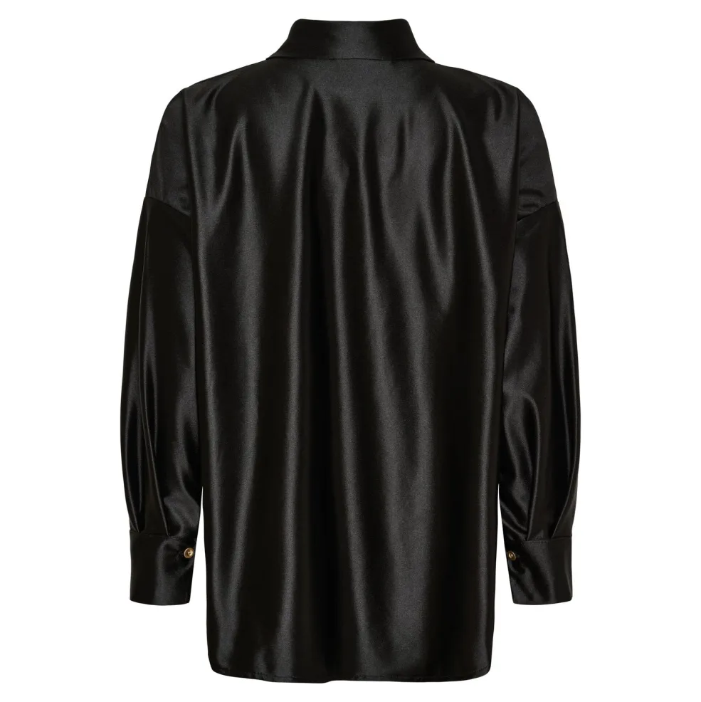 Sort skjorte fra Marta Du Chateau med skinnende overflade. Skjorten har klassisk skjortekrave, oversized pasform og lange ærmer med knaplukning.