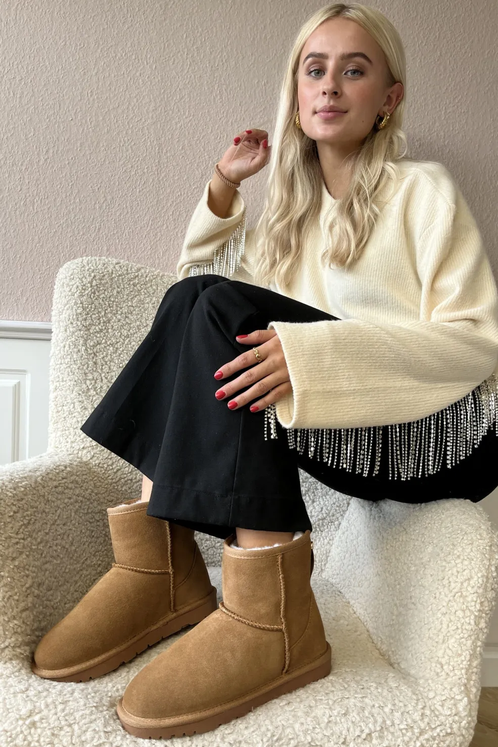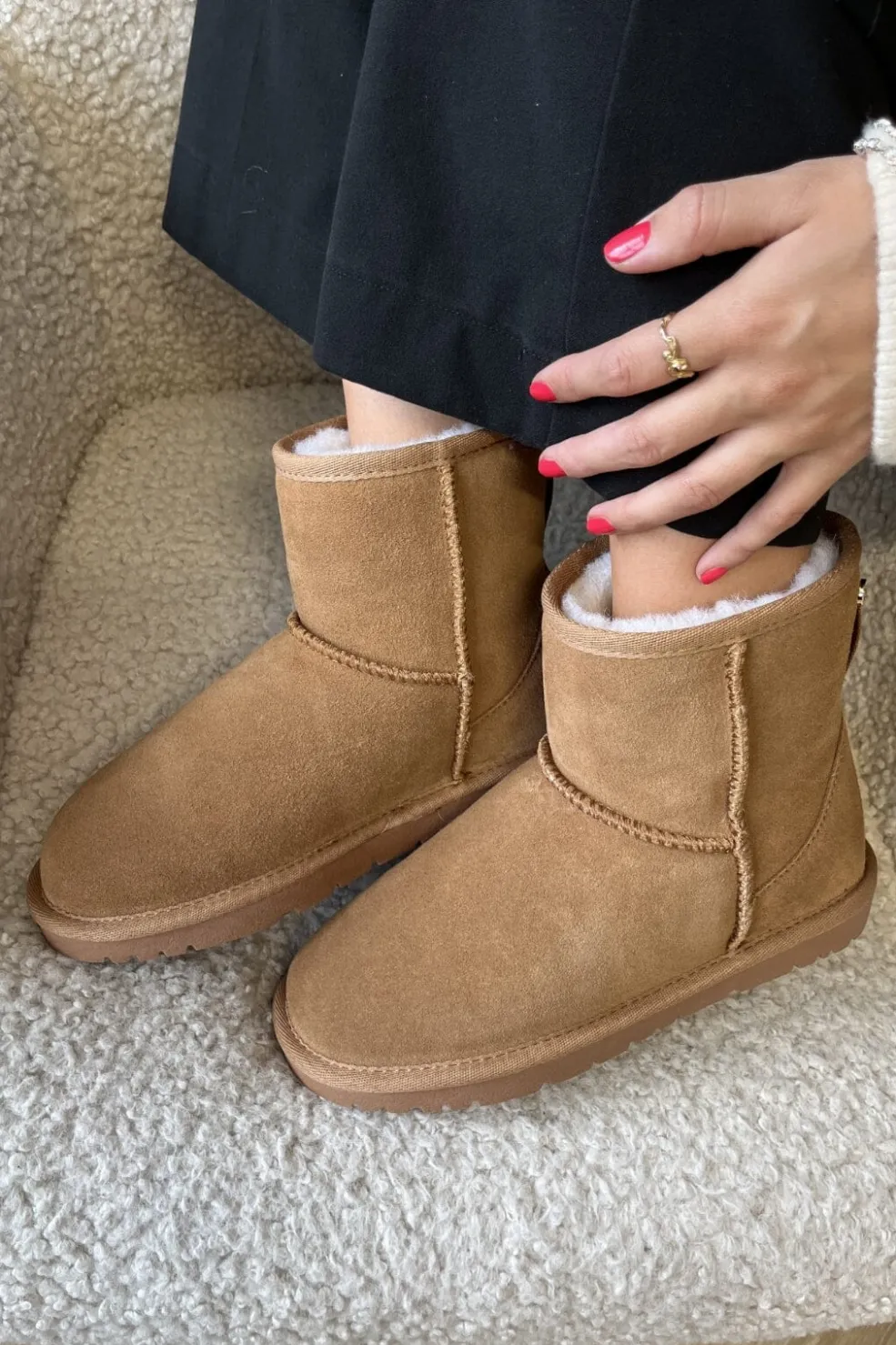 Ankelstøvler i kamelfarvet ruskind og læder fra Copenhagen Shoes. Støvlerne har en blød overflade og et varmt bamsefor, der gør dem ideelle til brug i hjemmet.