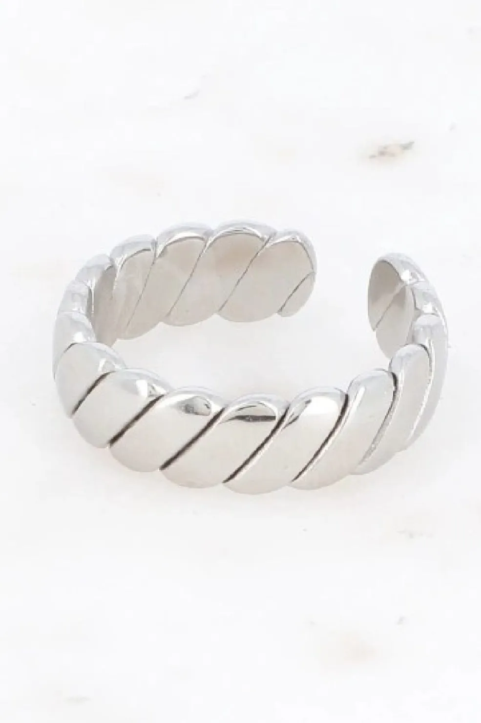 Sølvfarvet ring fra Mellow Moon med et snoet design. Ringen er fremstillet i rustfrit stål med en forsølvet overflade og har en højde på 6 mm.