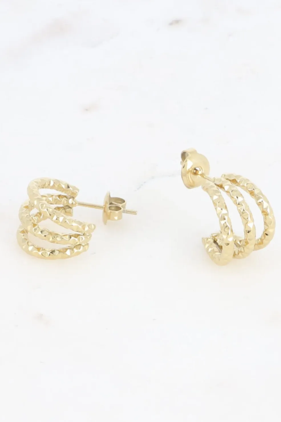 Forgyldte hoop-øreringe fra Mellow Moon med et spiralformet design. Øreringene har en facetteret overflade, der skaber et fint spil i lyset. De måler 15 x 15 millimeter.