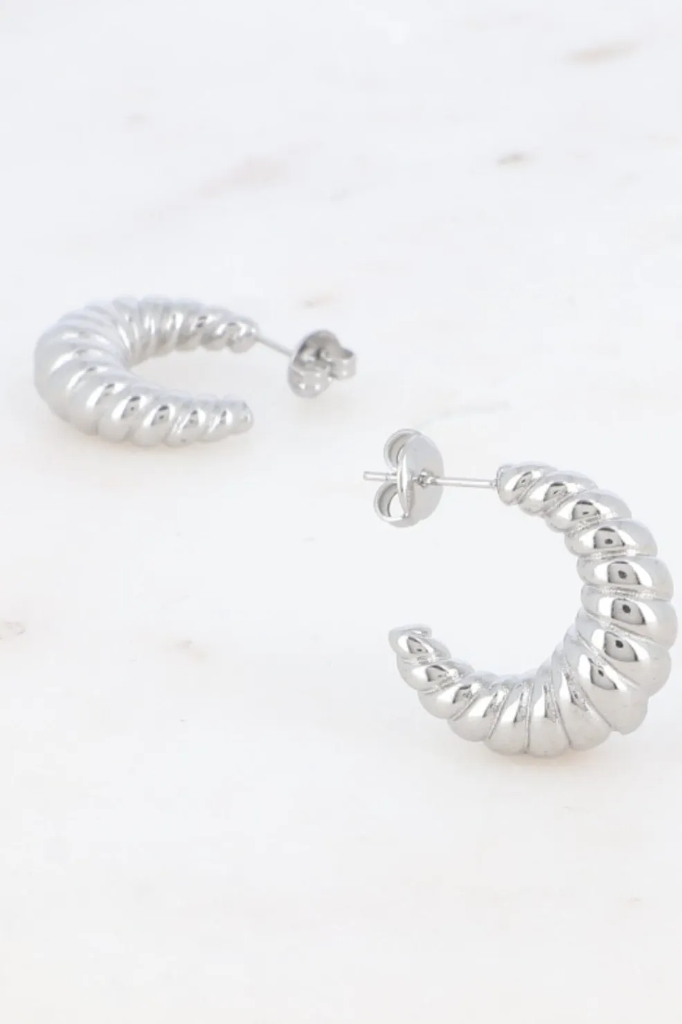 Forsølvede hoop-øreringe fra Mellow Moon med et spiralformet design. Øreringene har en blank overflade, der reflekterer lyset på en fin måde.