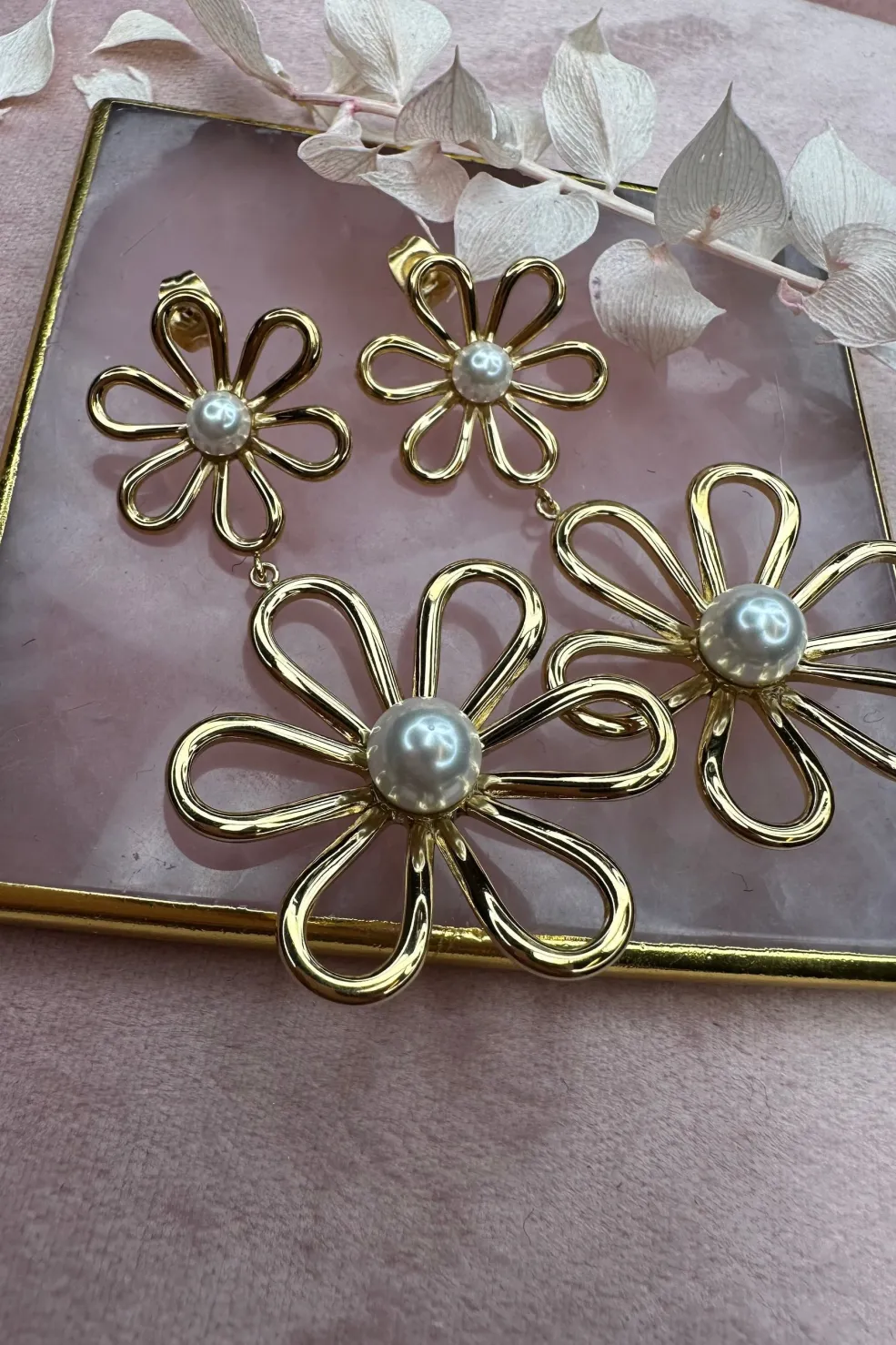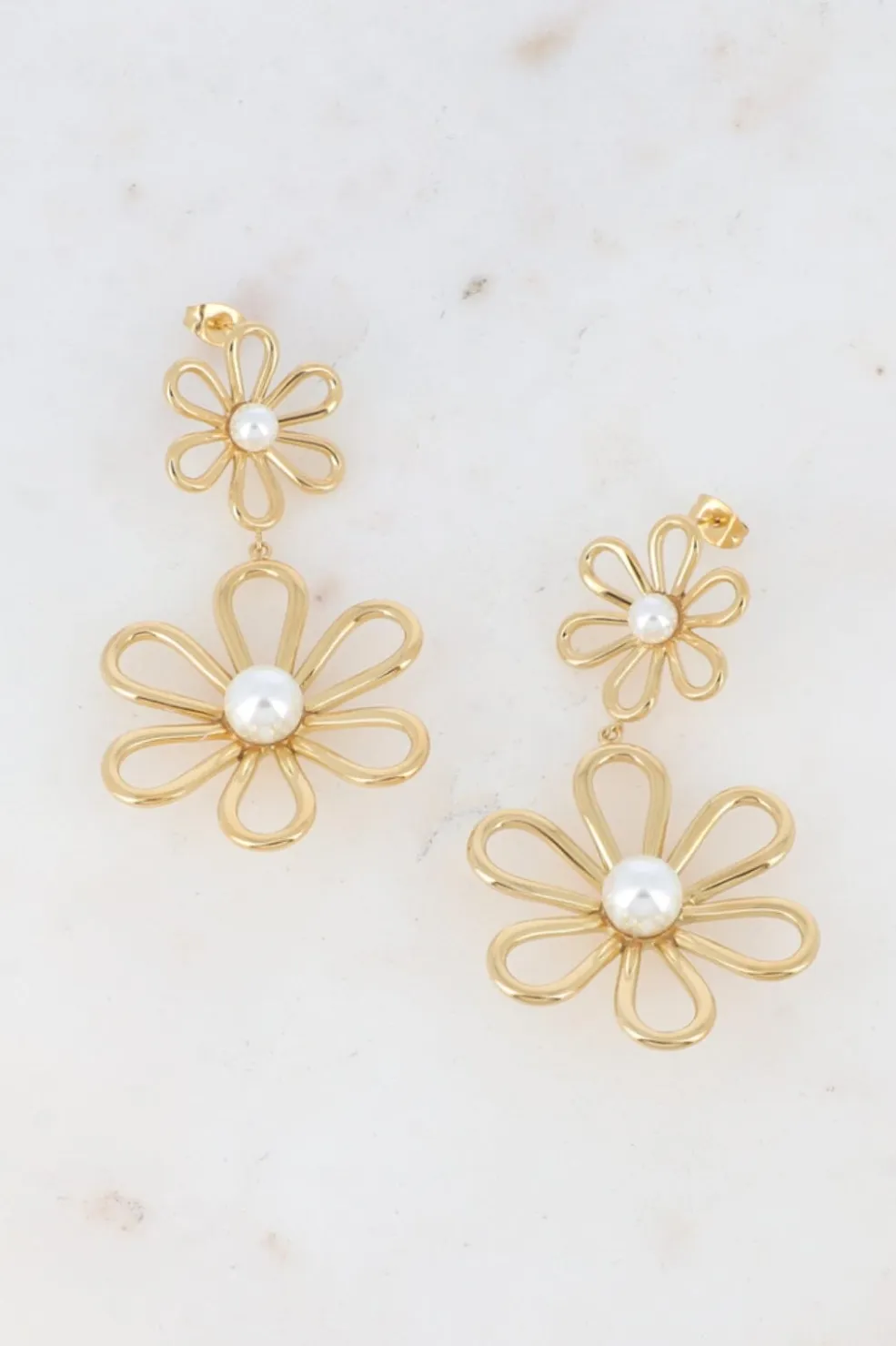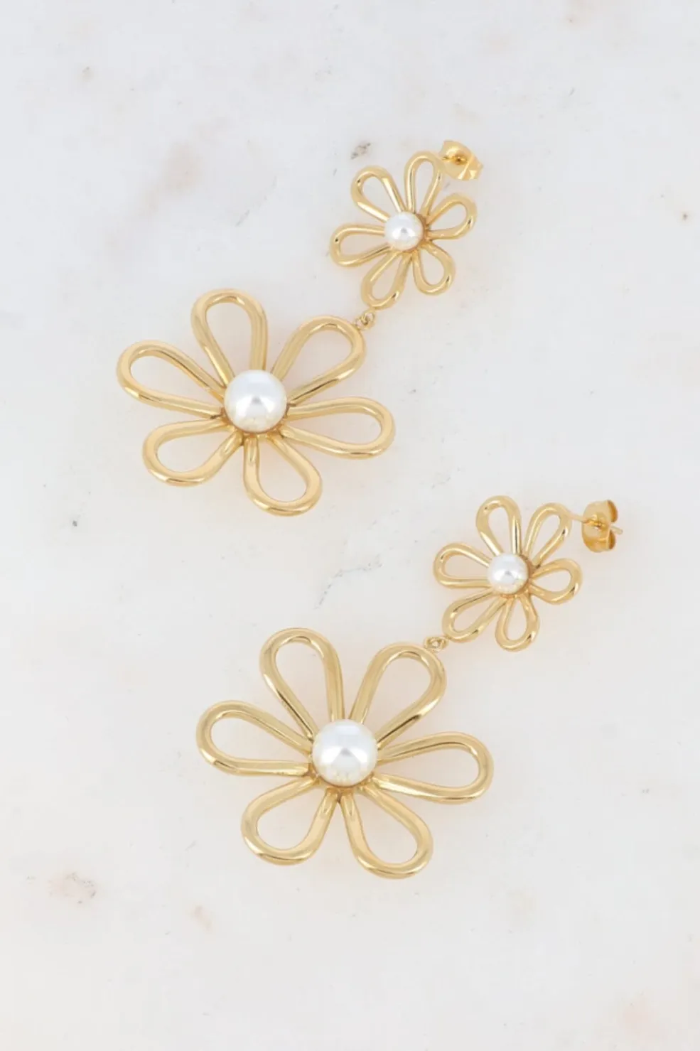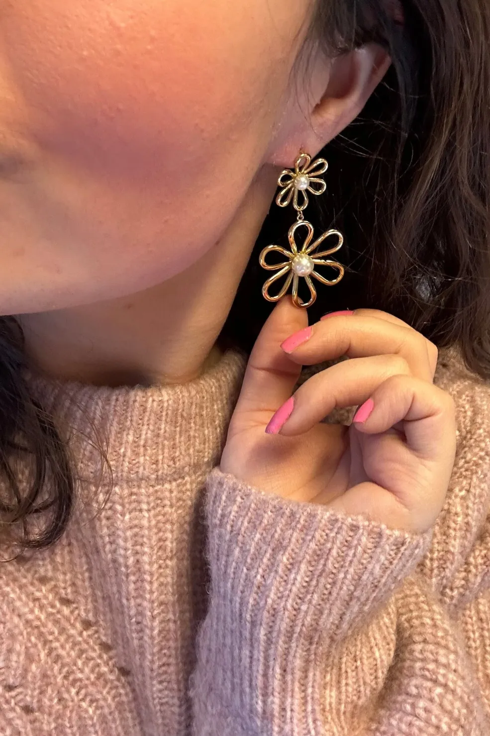 Hængeøreringe fra Mellow Moon med blomsterformet design i guldtonet finish. To blomster i forskellige størrelser er forbundet med kæder og har perledetaljer i midten.