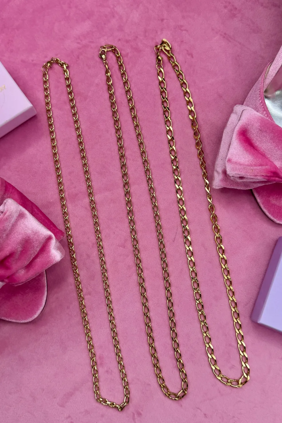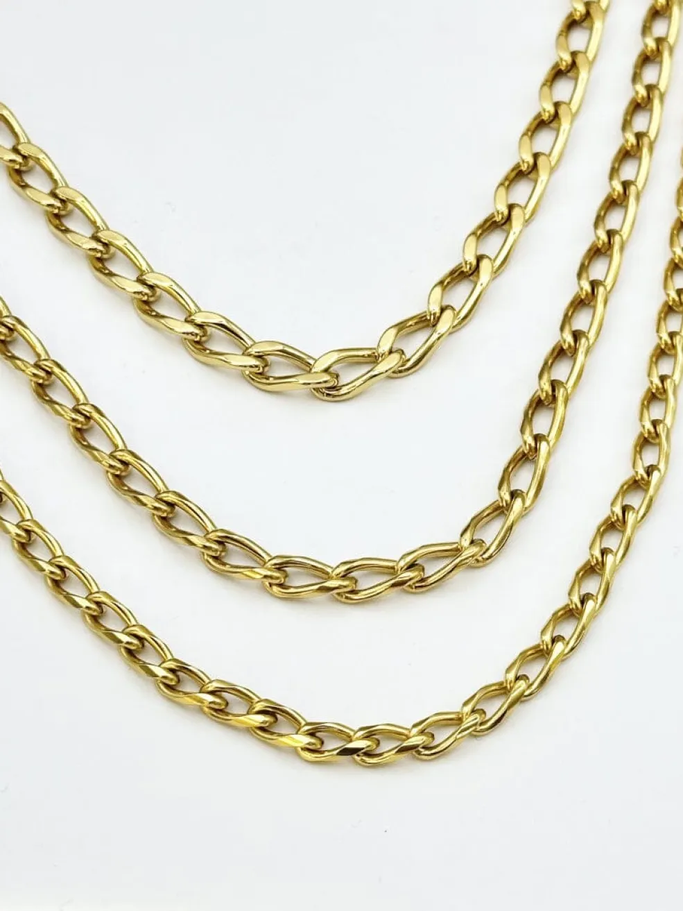 Forgyldt halskæde fra Mellow Moon med Figaro-meshdesign. Kæden har varierende tykkelser fra 4 til 10 millimeter og en længde på 60 centimeter.