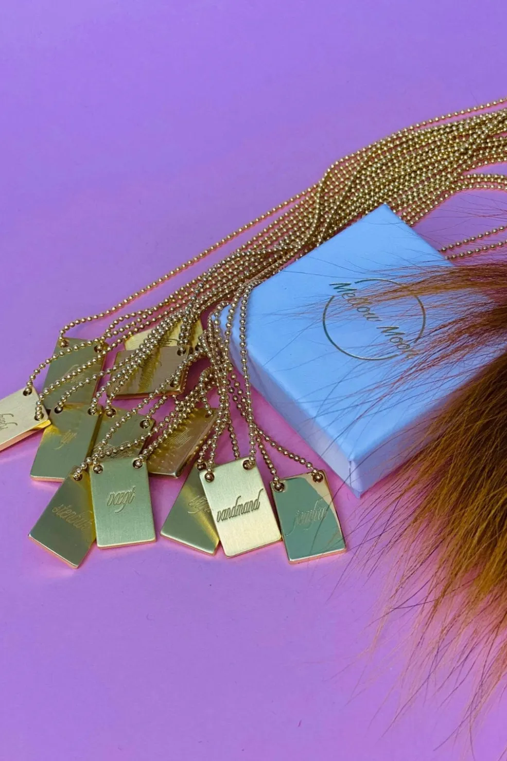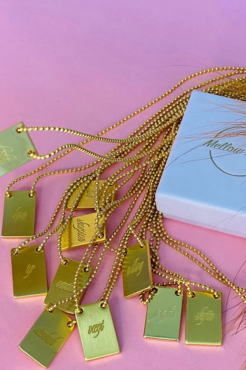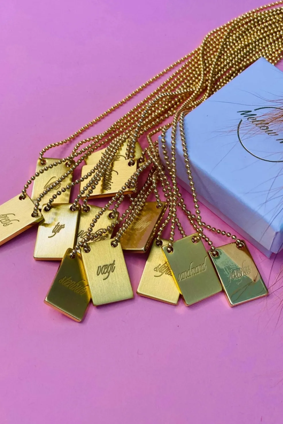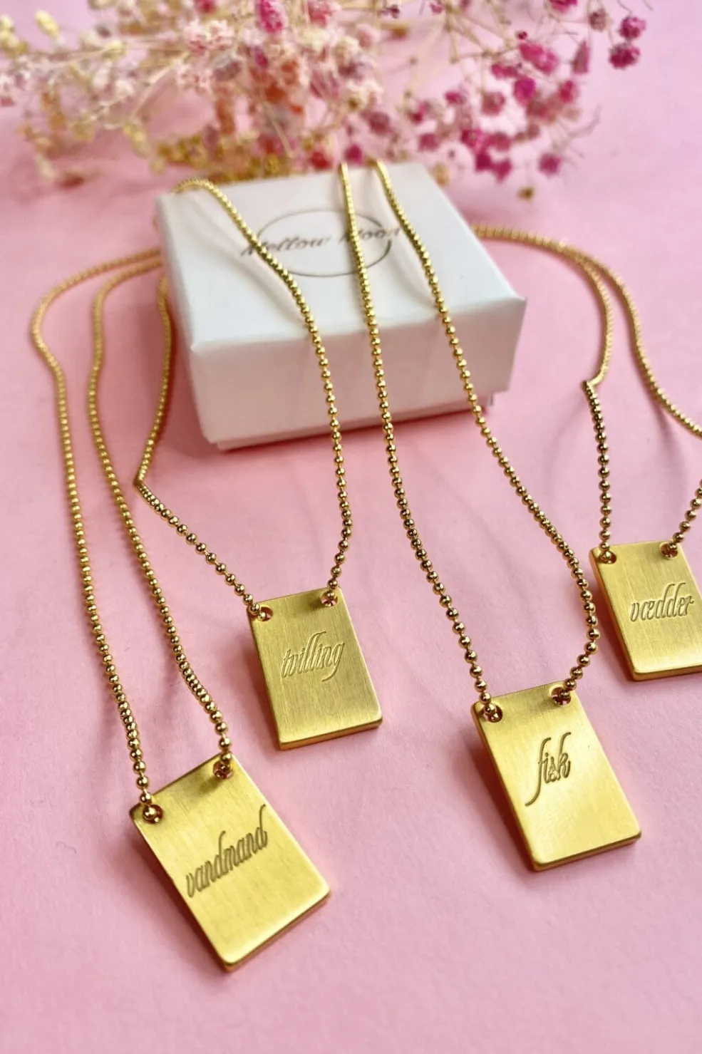 Forgyldt halskæde fra Mellow Moon med indgraveret stjernetegn på en gylden plade. Kæden har justerbar længde og kommer i en præsentationsæske.